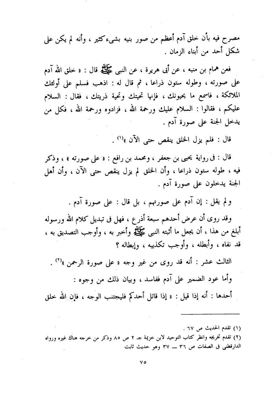 قال في رواية يحيى بن جعفر، ومحمد بن رافع: ((على صورته)) ، وذكر فيه: طوله ستون ذراعاً، وأن الخلق لم يزل ينقص حتى الآن، وأن أهل الجنة يدخلون على صورة آدم.