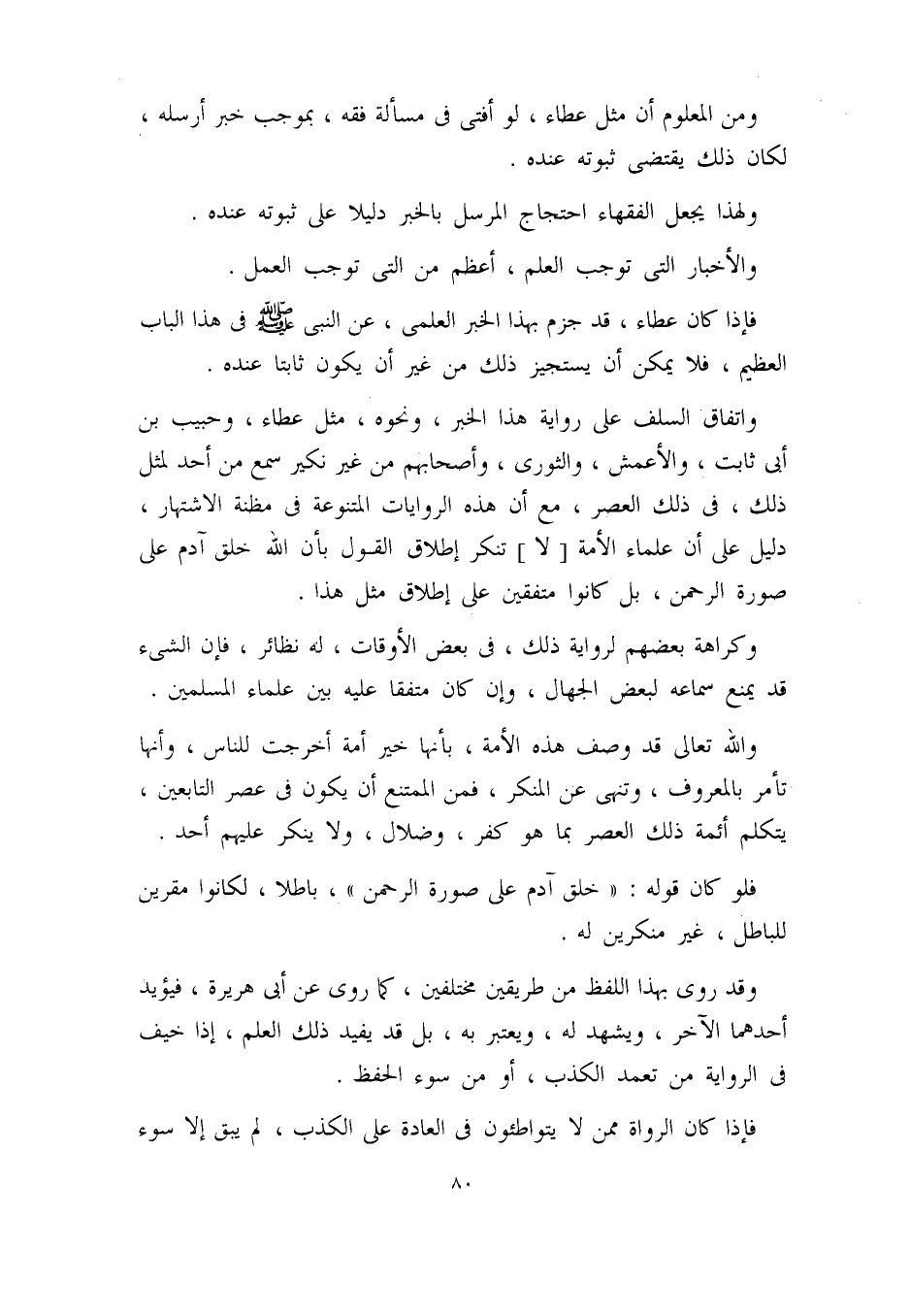 واتفاق السلف على رواية هذا الخبر، ونحوه، مثل عطاء، وحبيب بن أبي ثابت، والأعمش، والثوري، وأصحابهم، من غير نكير سمع من أحد لمثل ذلك، في ذلك العصر، مع أن هذه الروايات المتنوعة في مظنة الاشتهار، دليل على أن علماء الأمة [لا] تنكر إطلاق القول بأن الله خلق آدم على صورة الرحمن، بل كانوا متفقين على إطلاق مثل هذا.
