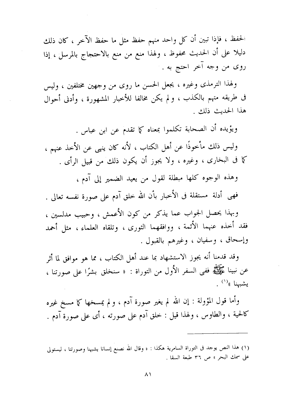 (¬1) هذا النص يوجد في التوراة السامرية هكذا: ((وقال الله: نصنع إنساناً يشبهنا وصورتنا، ليستولي على سمك البحر)) (ص36) طبعة السقا.