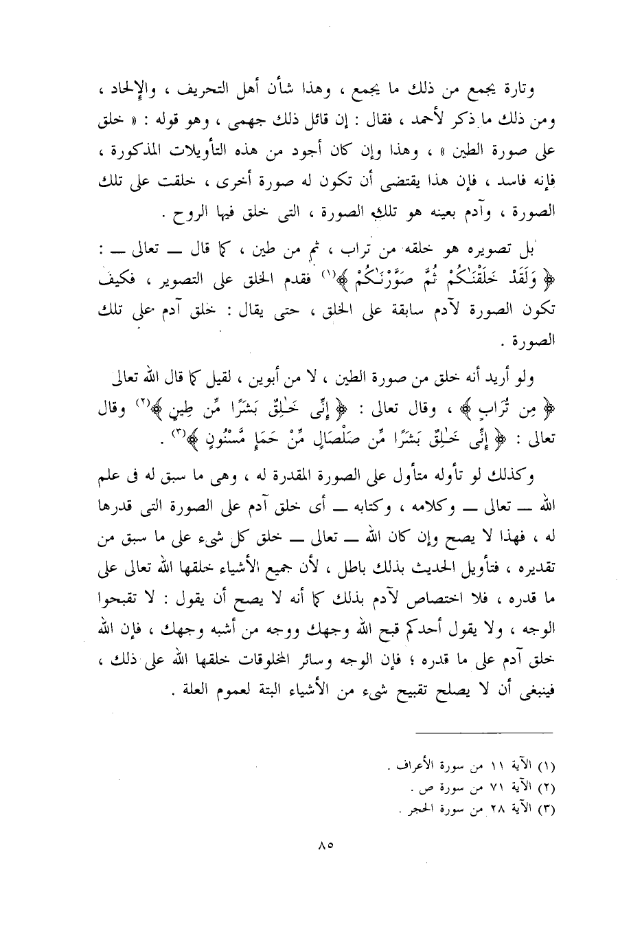 وتارة يجمع من ذلك ما يجمع، وهذا شأن أهل التحريف، والإلحاد، ومن ذلك ما ذكر لأحمد، فقال: إن قائل ذلك جهمي، وهو قوله: ((خلق على صورة الطين)) ، وهذا وإن كان أجود من هذه التأويلات المذكورة، فإنه فاسد، فإن هذا يقتضي أن تكون له صورة أخرى، خلقت على تلك الصورة، وآدم بعينه هو تلك الصورة، التي خلق فيها الروح.