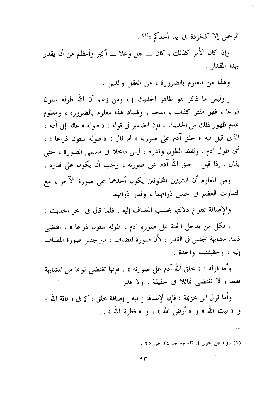 [وليس ما ذكر هو ظاهر الحديث] ، ومن زعم أن الله طوله ستون ذراعاً، فهو مفتر كذاب، ملحد، وفساد هذا معلوم بالضرورة، ومعلوم عدم ظهور ذلك من الحديث، فإن الضمير في قوله: ((طوله)) عائد إلى آدم، الذي قيل فيه ((خلق آدم على صورته)) ثم قال: ((طوله ستون ذراعاً)) ، أي: طول آدم، ولفظ الطول وقدره، ليس داخلاً في مسمى الصورة، حتى يقال: إذا قيل: خلق الله آدم على صورته، وجب أن يكون على قدره.