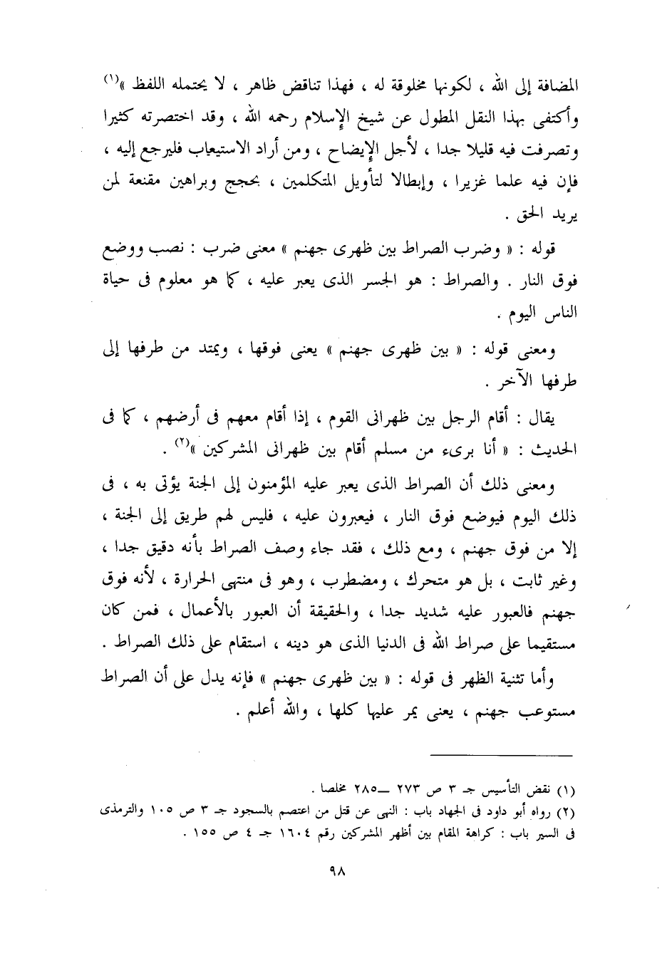 وأما تثنية الظهر في قوله: ((بين ظهري جهنم)) فإنه يدل على أن الصراط مستوعب جهنم، يعني يمر عليها كلها، والله أعلم.