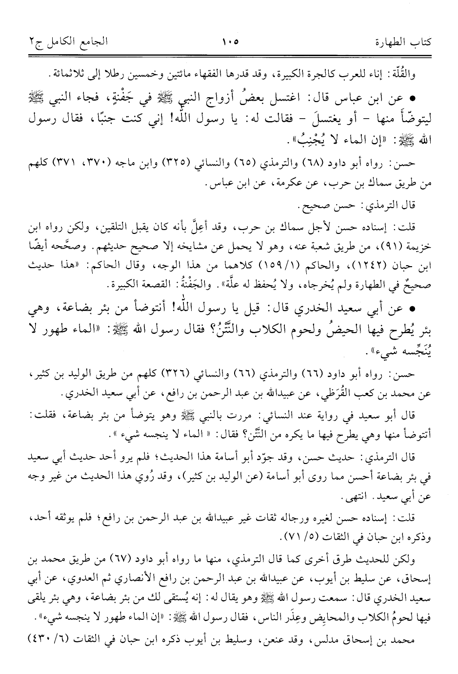 قال الترمذيّ: حديث حسن، وقد جوّد أبو أسامة هذا الحديث؛ فلم يرو أحد حديث أبي سعيد في بئر بضاعة أحسن مما روى أبو أسامة (عن الوليد بن كثير)، وقد رُوي هذا الحديث من غير وجه عن أبي سعيد. انتهى.
