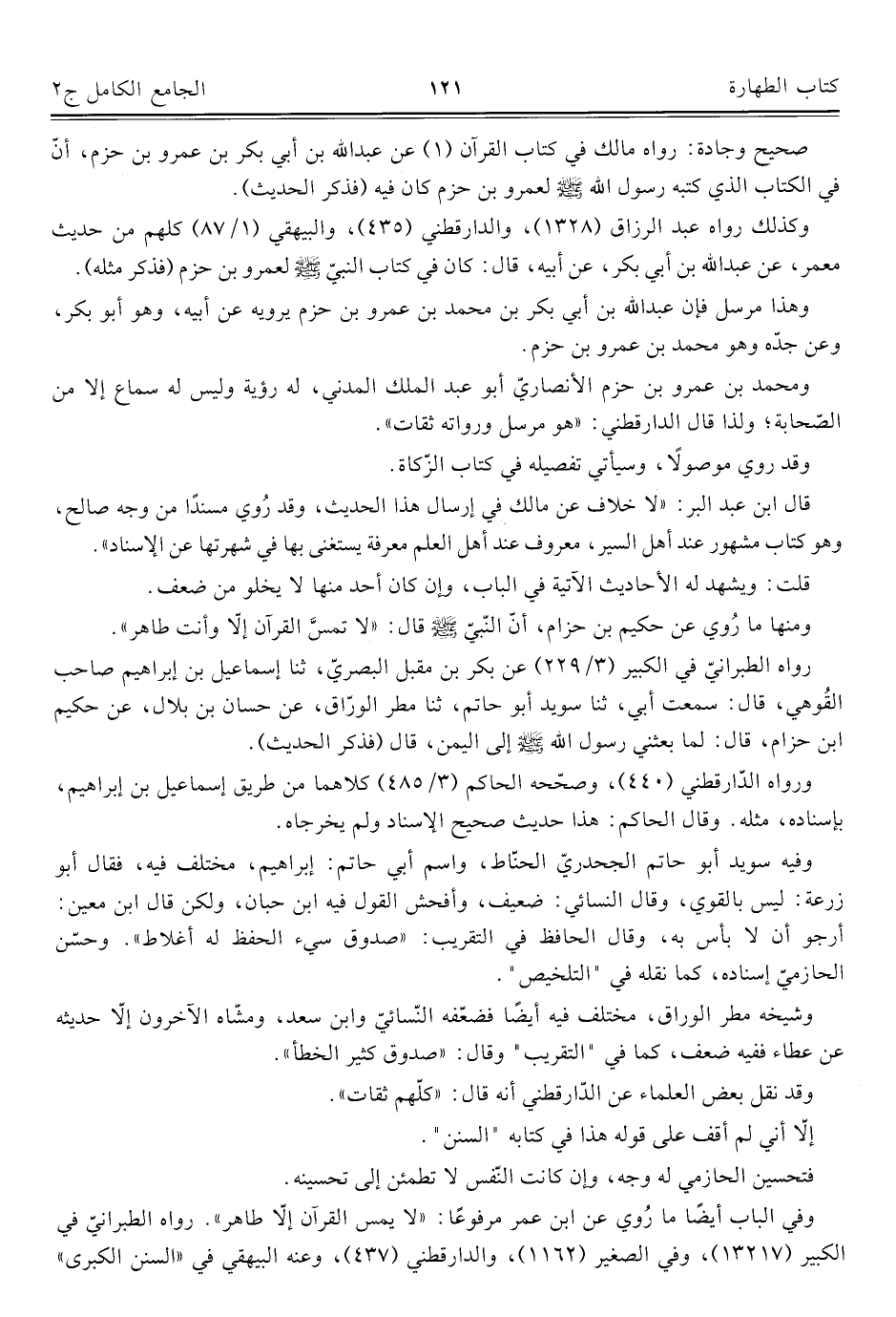صحيح وجادة: رواه مالك في كتاب القرآن (١) عن عبد الله بن أبي بكر بن عمرو بن حزم، أنّ في الكتاب الذي كتبه رسول الله - صلى الله عليه وسلم - لعمرو بن حزم كان فيه (فذكر الحديث).