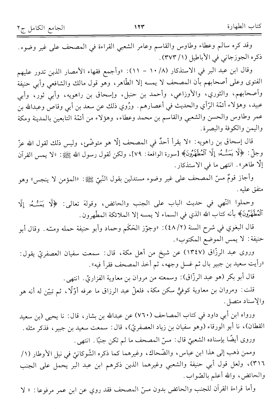 وقال ابن عبد البر في الاستذكار (٨/ ١٠ - ١١): "وأجمع فقهاء الأمصار الذين تدور عليهم الفتوى وعلى أصحابهم بأن المصحف لا يمسه إلا الطّاهر، وهو قول مالك والشافعي وأبي حنيفة وأصحابهم، والثوري، والأوزاعي، وأحمد بن حنبل، وإسحاق بن راهويه، وأبي ثور، وأبي عبيد، وهؤلاء أئمّة الرّأي والحديث في أعصارهم. ورُوي ذلك عن سعد بن أبي وقاص وعبد الله بن عمر وطاوس والحسن والشعبي والقاسم بن محمد وعطاء، وهؤلاء من أئمّة التابعين بالمدينة ومكة واليمن والكوفة والبصرة.