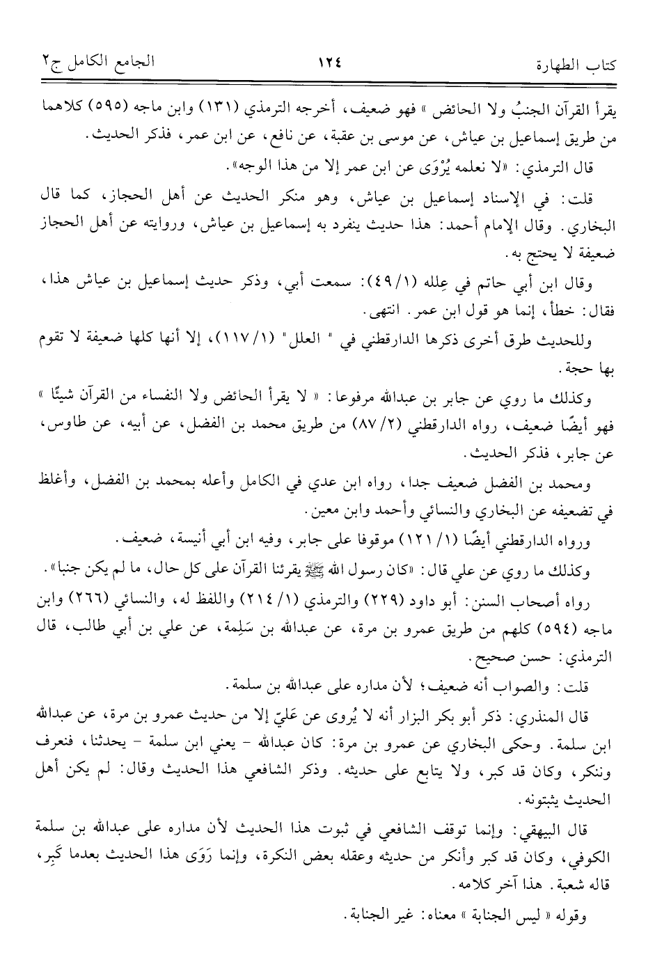 يقرأ القرآن الجنبُ ولا الحائض" فهو ضعيف، أخرجه الترمذي (١٣١) وابن ماجه (٥٩٥) كلاهما من طريق إسماعيل بن عياش، عن موسى بن عقبة، عن نافع، عن ابن عمر، فذكر الحديث.
