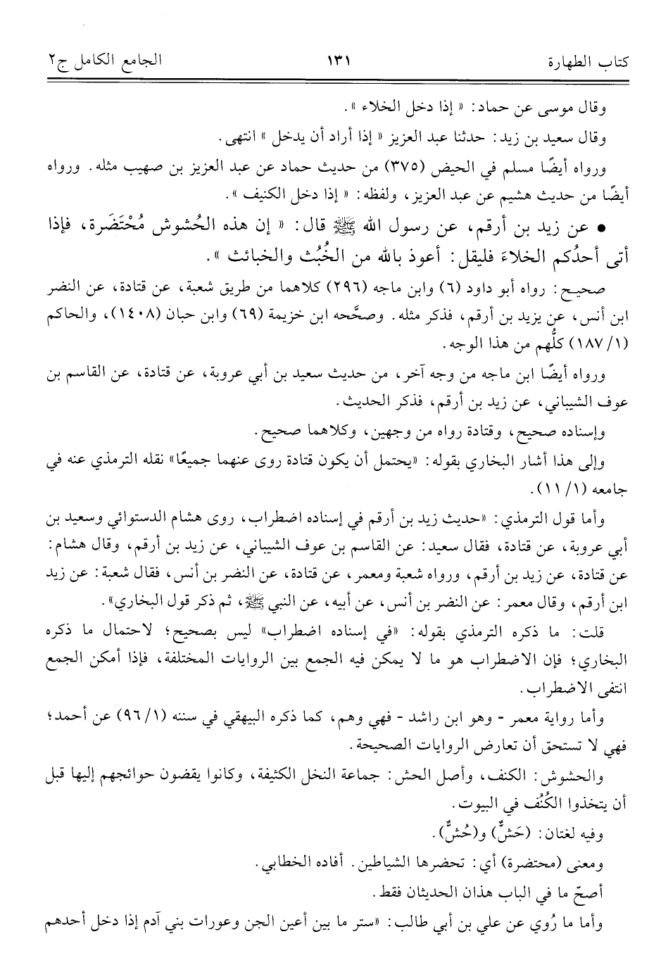 • عن زيد بن أرقم، عن رسول الله - صلى الله عليه وسلم - قال: "إن هذه الحُشوش مُحْتَضَرة، فإذا أتى أحدُكم الخلاءَ فليقل: أعوذ بالله من الخُبُث والخبائث".