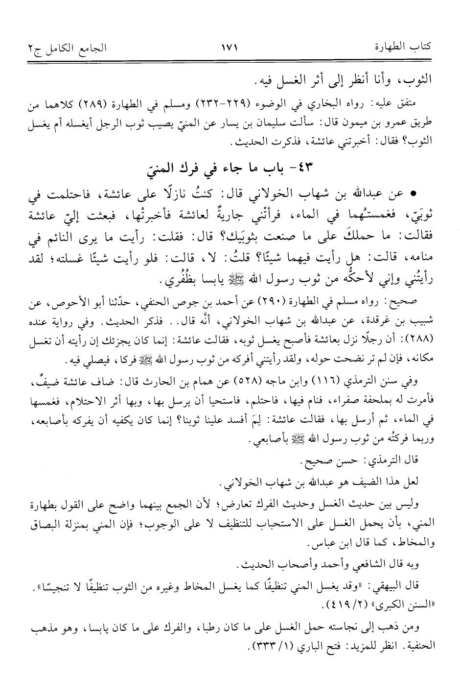 وفي سنن الترمذي (١١٦) وابن ماجه (٥٢٨) عن همام بن الحارث قال: ضاف عائشة ضيفٌ، فأمرت له بملحفة صفراء، فنام فيها، فاحتلم، فاستحيا أن يرسل بها، وبها أثر الاحتلام، فغمسها في الماء، ثم أرسل بها، فقالت عائشة: لم أفسد علينا ثوبنا؟ إنما كان يكفيه أن يفركه بأصابعه، وربما فركتُه من ثوب رسول الله صلى الله عليه وسلم بأصابعي.