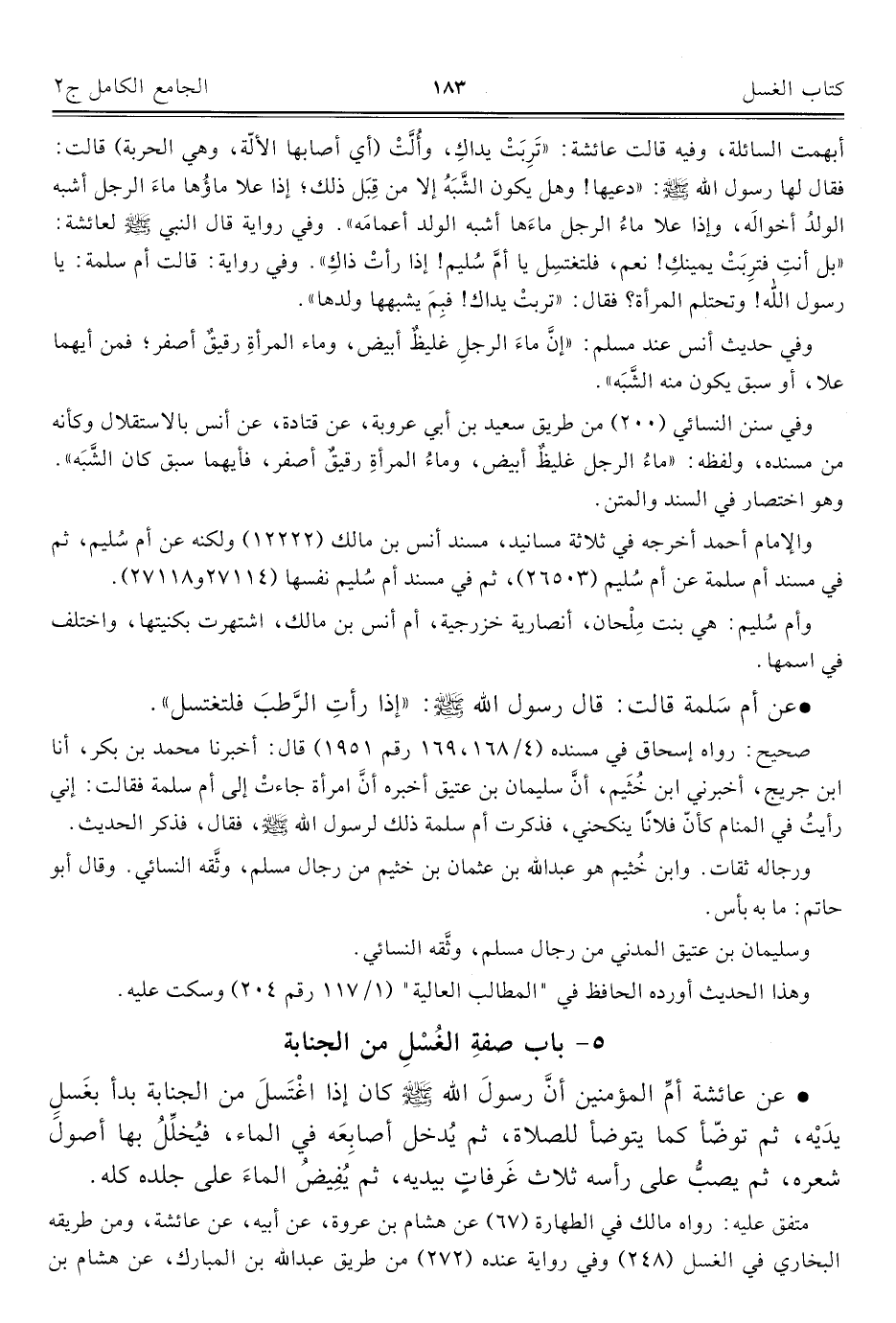 أبهمت السائلة، وفيه قالت عائشة: "تَرِبَتْ يداكٍ، وأُلَّتْ (أي أصابها الألّة، وهي الحربة) قالت: فقال لها رسول الله - صلى الله عليه وسلم -: "دعيها! وهل يكون الشَّبَهُ إِلَّا من قِبَل ذلك؛ إذا علا ماؤها ماءَ الرّجل أشبه الولدُ أخوالَه، وإذا علا ماءُ الرّجل ماءَها أشبه الولد أعمامَه". وفي رواية قال النَّبِيّ - صلى الله عليه وسلم - لعائشة: "بل أنتِ فترِبَتْ يمينكِ! نعم، فلتغتسِل يا أمَّ سُليم! إذا رأت ذاكِ". وفي رواية: قالت أم سلمة: يا رسول الله! وتحتلم المرأة؟ فقال: "تربتْ يداك! فبِمَ يشبهها ولدها".