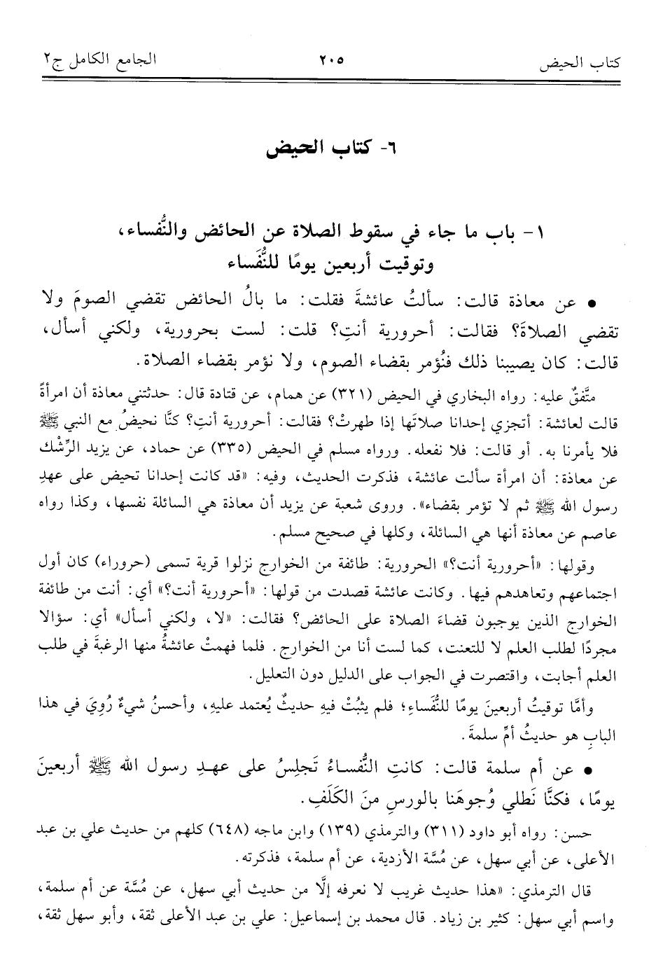• عن معاذة قالت: سألتُ عائشةَ فقلت: ما بالُ الحائض تقضي الصومَ ولا تقضي الصلاةَ؟ فقالت: أحرورية أنتِ؟ قلت: لست بحرورية، ولكني أسأل، قالت: كان يصيبنا ذلك فنُؤمر بقضاء الصوم، ولا نؤمر بقضاء الصلاة.