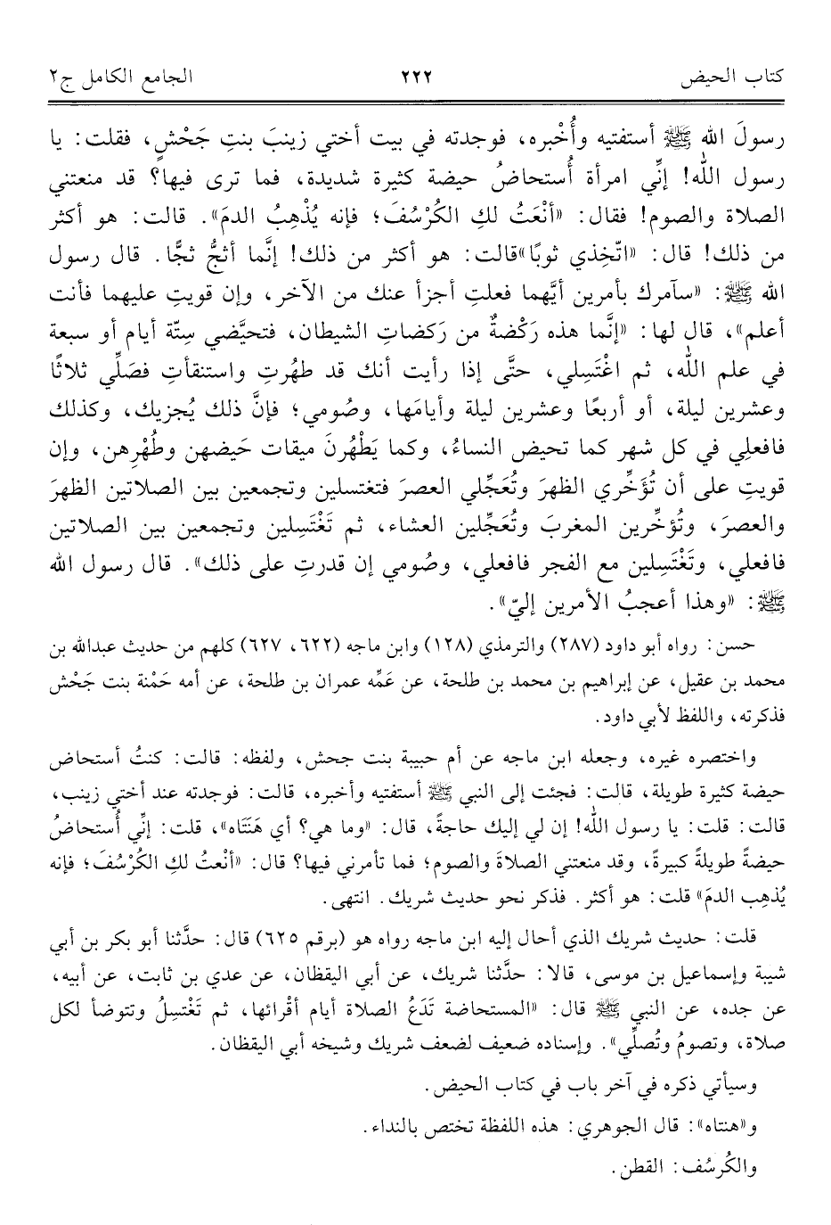 واختصره غيره، وجعله ابن ماجه عن أم حبيبة بنت جحش، ولفظه: قالت: كنتُ أستحاض حيضة كثيرة طويلة، قالت: فجئت إلى النبي - صلى الله عليه وسلم - أستفتيه وأخبره، قالت: فوجدته عند أختي زينب، قالت: قلت: يا رسول الله! إن لي إليك حاجةً، قال: "وما هي؟ أي هَنَتَاه"، قلت: إنِّي أُستحاضُ حيضةً طويلةً كبيرةً، وقد منعتني الصلاةَ والصوم؛ فما تأمرني فيها؟ قال: "أنْعتُ لكِ الكُرْسُفَ؛ فإنه يُذهِب الدمَ" قلت: هو أكثر. فذكر نحو حديث شريك. انتهى.