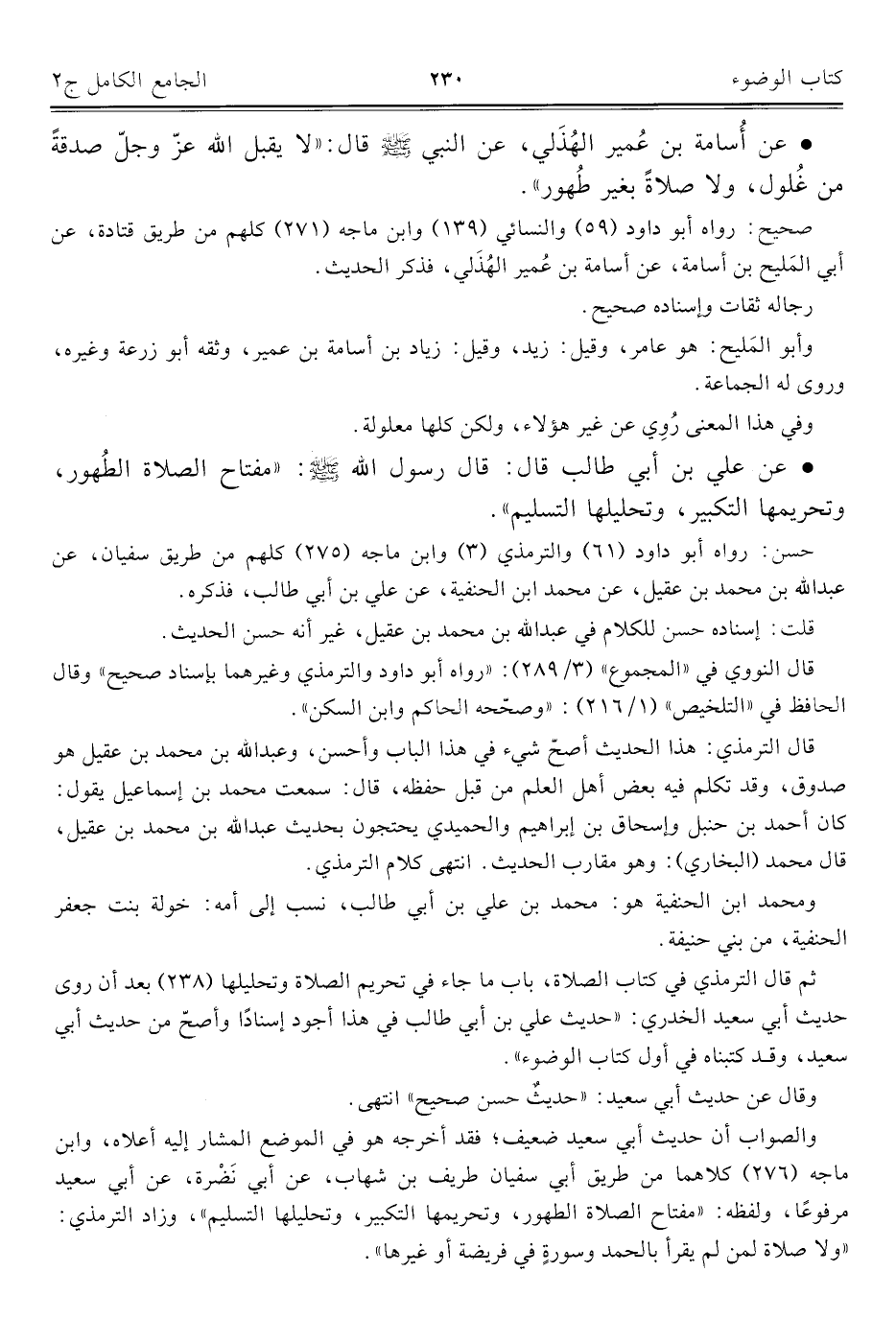 ثم قال الترمذي في كتاب الصلاة، باب ما جاء في تحريم الصلاة وتحليلها (٢٣٨) بعد أن روى حديث أبي سعيد الخدري: "حديث علي بن أبي طالب في هذا أجود إسنادًا وأصحّ من حديث أبي سعيد، وقد كتبناه في أول كتاب الوضوء".