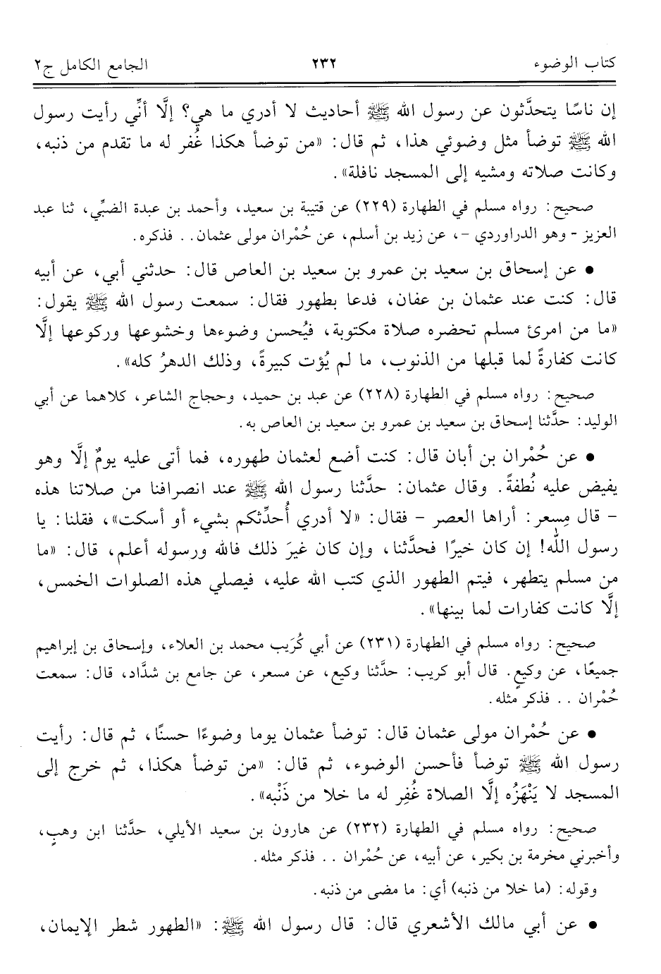• عن حُمْران بن أبان قال: كنت أضع لعثمان طهوره، فما أتي عليه يومٌ إلَّا وهو يفيض عليه نُطفةً. وقال عثمان: حدَّثنا رسول الله - صلى الله عليه وسلم - عند انصرافنا من صلاتنا هذه - قال مِسعر: أراها العصر - فقال: "لا أدري أُحدِّثكم بشيء أو أسكت"، فقلنا: يا رسول الله! إن كان خيرًا فحدَّثنا، وإن كان غيرَ ذلك فالله ورسوله أعلم، قال: "ما من مسلم يتطهر، فيتم الطهور الذي كتب الله عليه، فيصلي هذه الصلوات الخمس، إلَّا كانت كفارات لما بينها".