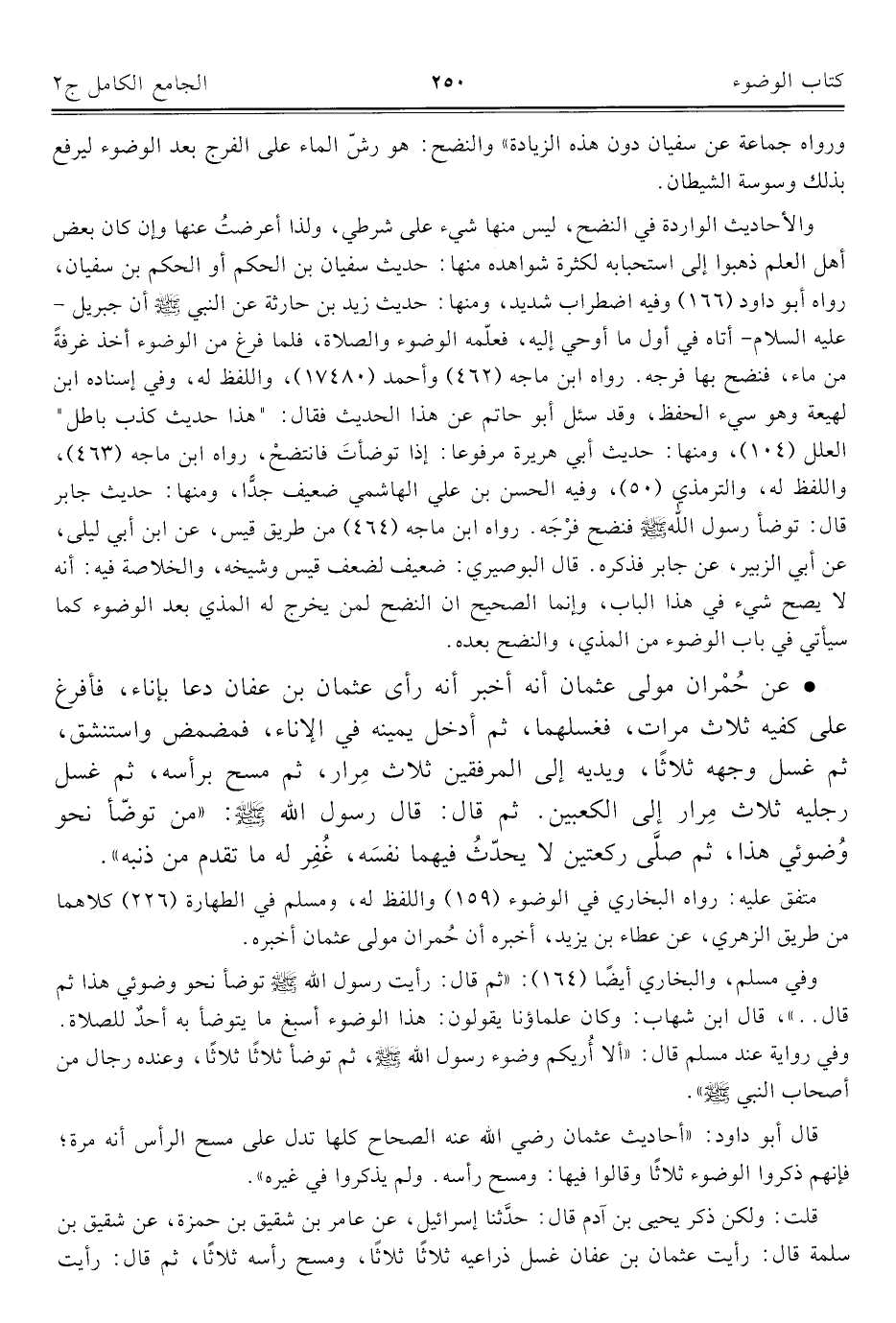 والأحاديث الواردة في النضح، ليس منها شيء على شرطي، ولذا أعرضتُ عنها وإن كان بعض أهل العلم ذهبوا إلى استحبابه لكثرة شواهده منها: حديث سفيان بن الحكم أو الحكم بن سفيان، رواه أبو داود (١٦٦) وفيه اضطراب شديد، ومنها: حديث زيد بن حارثة عن النبي - صلى الله عليه وسلم - أن جبريل - عليه السلام - أتاه في أول ما أوحي إليه، فعلّمه الوضوء والصلاة، فلما فرغ من الوضوء أخذ غرفةً من ماء، فنضح بها فرجه، رواه ابن ماجه (٤٦٢) وأحمد (١٧٤٨٠)، واللفظ له، وفي إسناده ابن لهيعة وهو سيء الحفظ، وقد سئل أبو حاتم عن هذا الحديث فقال: "هذا حديث كذب باطل" العلل (١٠٤)، ومنها: حديث أبي هريرة مرفوعا: إذا توضأتَ فانتضحْ، رواه ابن ماجه (٤٦٣)، واللفظ له، والترمذي (٥٠)، وفيه الحسن بن علي الهاشمي ضعيف جدًّا، ومنها: حديث جابر قال: توضأ رسول الله - صلى الله عليه وسلم - فنضح فرْجَه. رواه ابن ماجه (٤٦٤) من طريق قيس، عن ابن أبي ليلى، عن أبي الزبير، عن جابر فذكره. قال البوصيري: ضعيف لضعف قيس وشيخه، والخلاصة فيه: أنه لا يصح شيء في هذا الباب، وإنما الصحيح أن النضح لمن يخرج له المذي بعد الوضوء كما سيأتي في باب الوضوء من المذي، والنضح بعده.