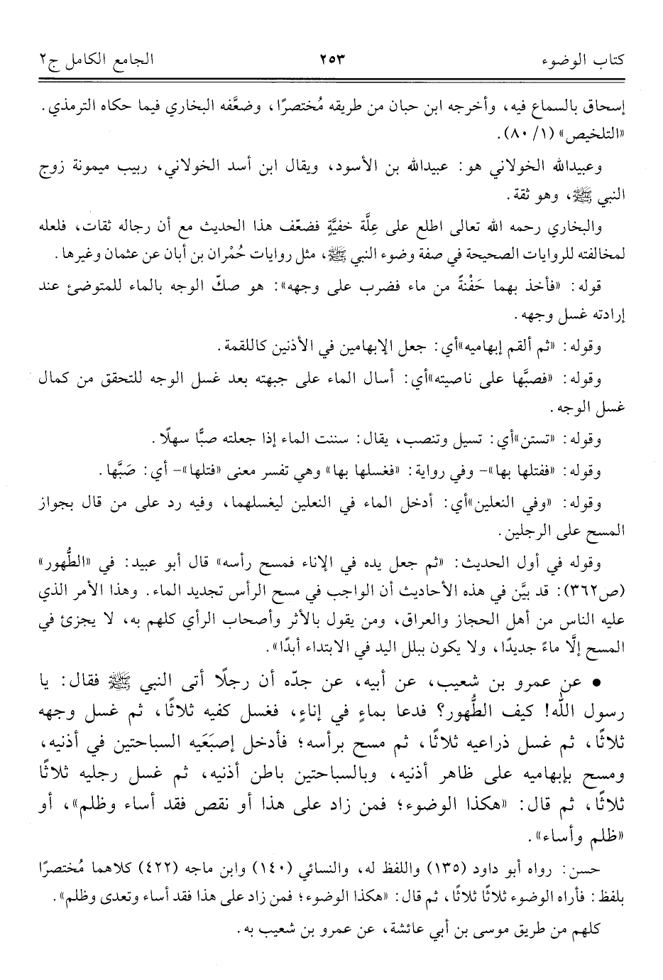 • عن عمرو بن شعيب، عن أبيه، عن جدّه أن رجلًا أتى النبي - صلى الله عليه وسلم - فقال: يا رسول الله! كيف الطُّهور؟ فدعا بماءٍ في إناءٍ، فغسل كفيه ثلاثًا، ثم غسل وجهه ثلاثًا، ثم غسل ذراعيه ثلاثًا، ثم مسح برأسه؛ فأدخل إصبَعَيه السباحتين في أذنيه، ومسح بإبهاميه على ظاهر أذنيه، وبالسباحتين باطن أذنيه، ثم غسل رجليه ثلاثًا ثلاثًا، ثم قال: "هكذا الوضوء؛ فمن زاد على هذا أو نقص فقد أساء وظلم"، أو "ظلم وأساء".