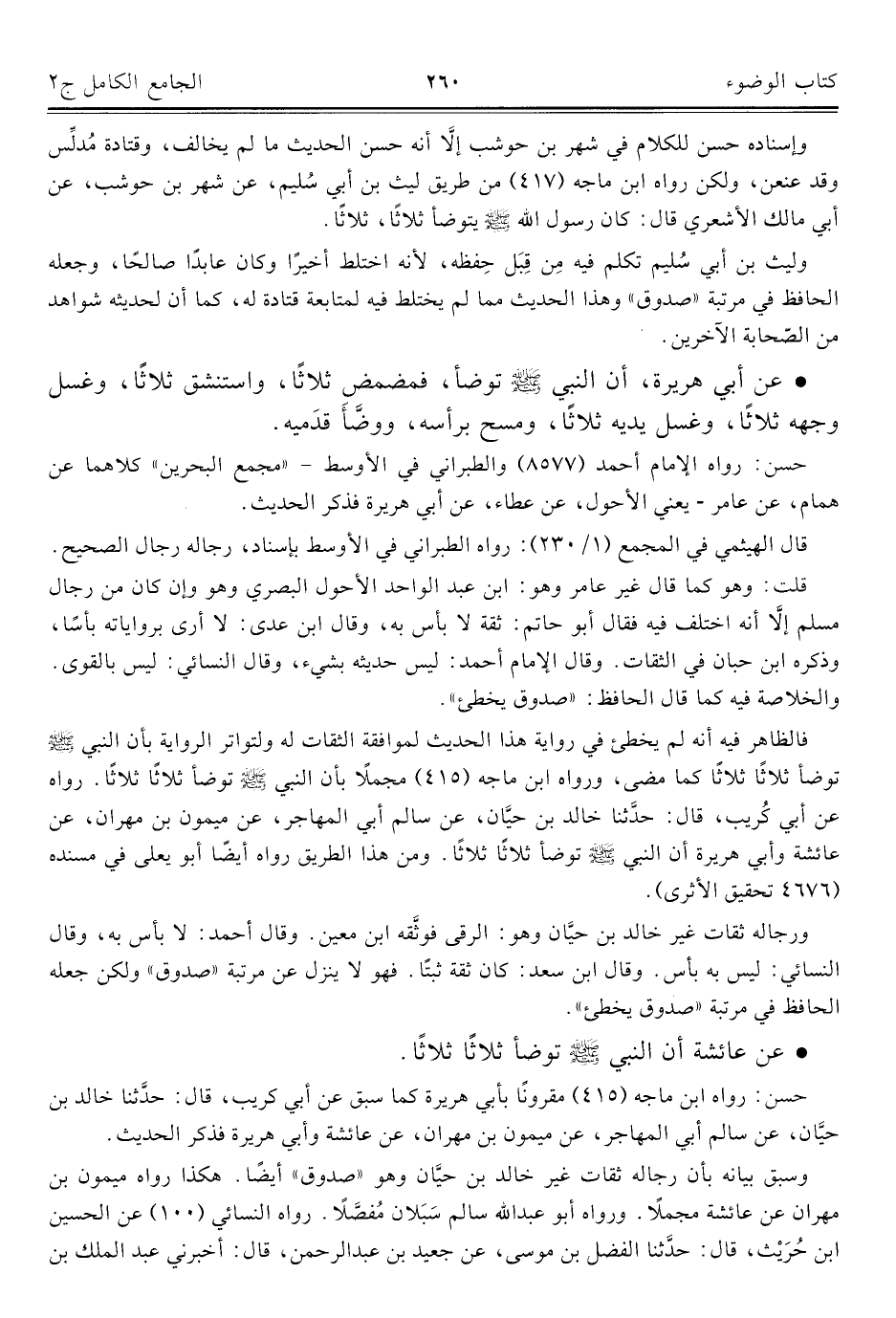 فالظاهر فيه أنه لم يخطئ في رواية هذا الحديث لموافقة الثقات له ولتواتر الرواية بأن النبي صلى الله عليه وسلم توضأ ثلاثًا ثلاثًا كما مضى، ورواه ابن ماجه (٤١٥) مجملًا بأن النبي - صلى الله عليه وسلم - توضأ ثلاثًا ثلاثًا. رواه عن أبي كُريب، قال: حدَّثنا خالد بن حيَّان، عن سالم أبي المهاجر، عن ميمون بن مهران، عن عائشة وأبي هريرة أن النبي صلى الله عليه وسلم توضأ ثلاثًا ثلاثًا. ومن هذا الطريق رواه أيضًا أبو يعلى في مسنده (٤٦٧٦ تحقيق الأثرى).