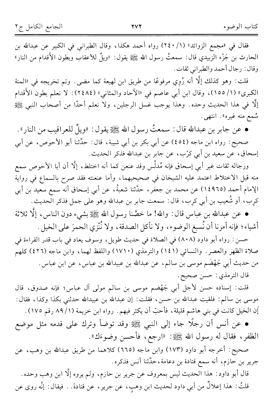 فقال في "مجمع الزوائد" (١/ ٢٤٠) رواه أحمد هكذا، وقال الطبراني في الكبير عن عبد الله بن الحارث بن جَزْء الزبيدي قال: سمعتُ رسول الله - صلى الله عليه وسلم - يقول: "ويلٌ للأعقاب وبطون الأَقدام من النار" وقال: رجال أحمد والطبراني ثقات.