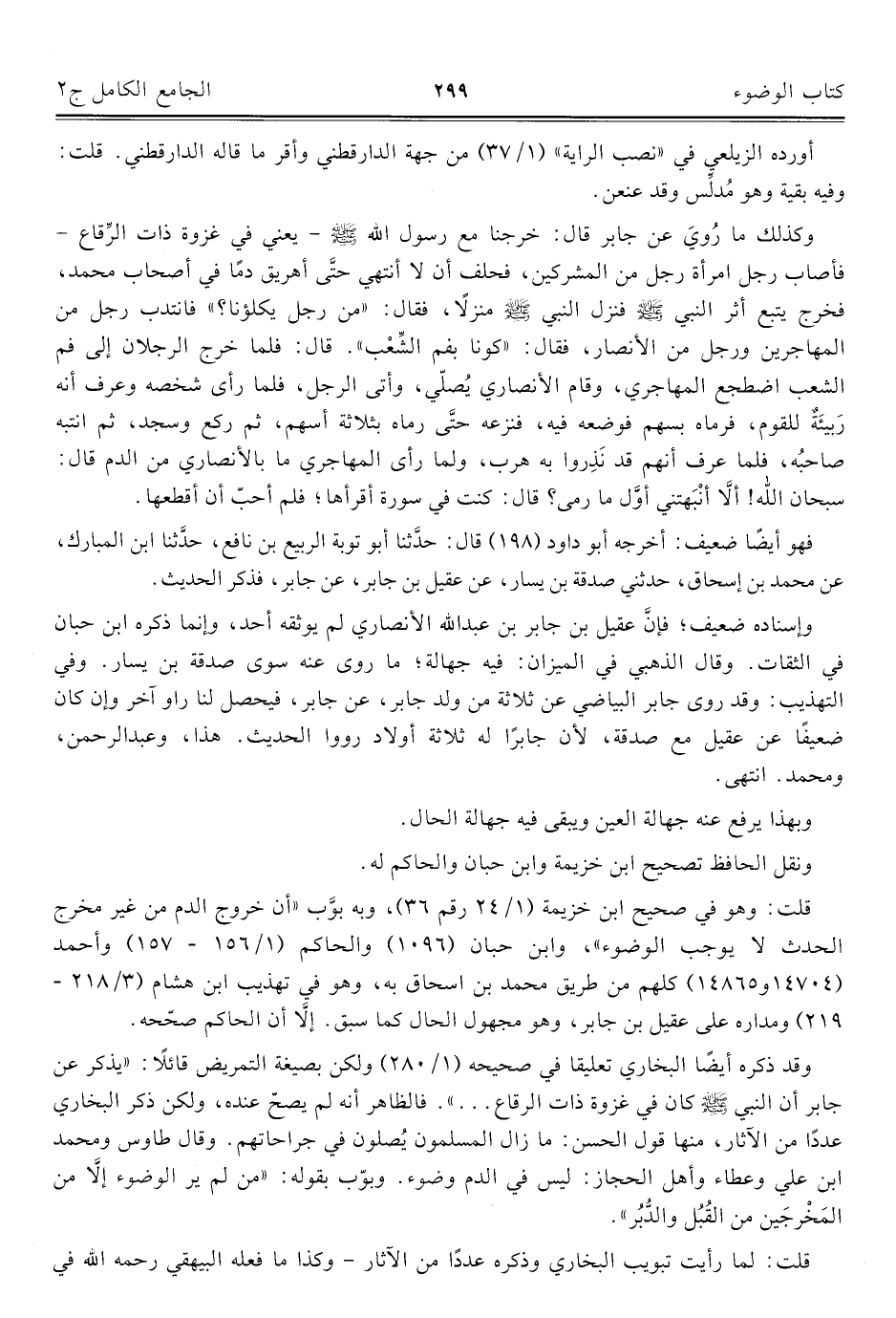 وقد ذكره أيضًا البخاري تعليقا في صحيحه (١/ ٢٨٠) ولكن بصيغة التمريض قائلًا: "يذكر عن جابر أن النبي - صلى الله عليه وسلم - كان في غزوة ذات الرقاع ... ". فالظاهر أنه لم يصحّ عنده، ولكن ذكر البخاري عددا من الآثار، منها قول الحسن: ما زال المسلمون يُصلون في جراحاتهم. وقال طاوس ومحمد بن علي وعطاء وأهل الحجاز: ليس في الدم وضوء. وبوَّب بقوله: "من لم ير الوضوء إلَّا من المَخْرجَين من القُبُل والدُّبُر".