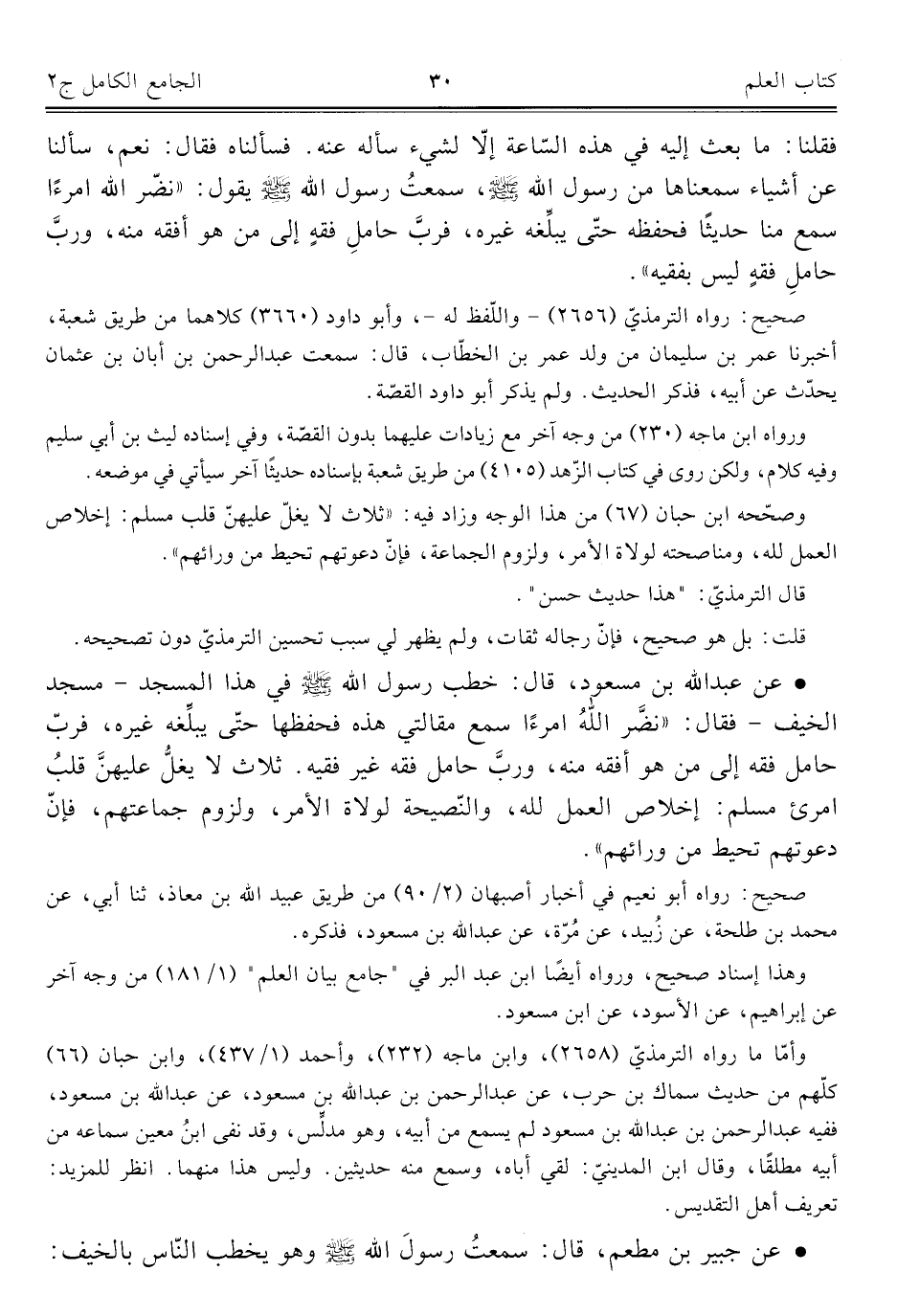 • عن عبد اللَّه بن مسعود، قال: خطب رسول اللَّه -صلى اللَّه عليه وسلم- في هذا المسجد -مسجد الخيف- فقال: "نضَّر اللَّهُ امرءًا سمع مقالتي هذه فحفظها حتّى يبلِّغه غيره، فربَّ حامل فقه إلى من هو أفقه منه، وربَّ حامل فقه غير فقيه. ثلاث لا يغلُّ عليهنَّ قلبُ امرئ مسلم: إخلاص العمل للَّه، والنّصيحة لولاة الأمر، ولزوم جماعتهم، فإنّ دعوتهم تحيط من ورائهم".