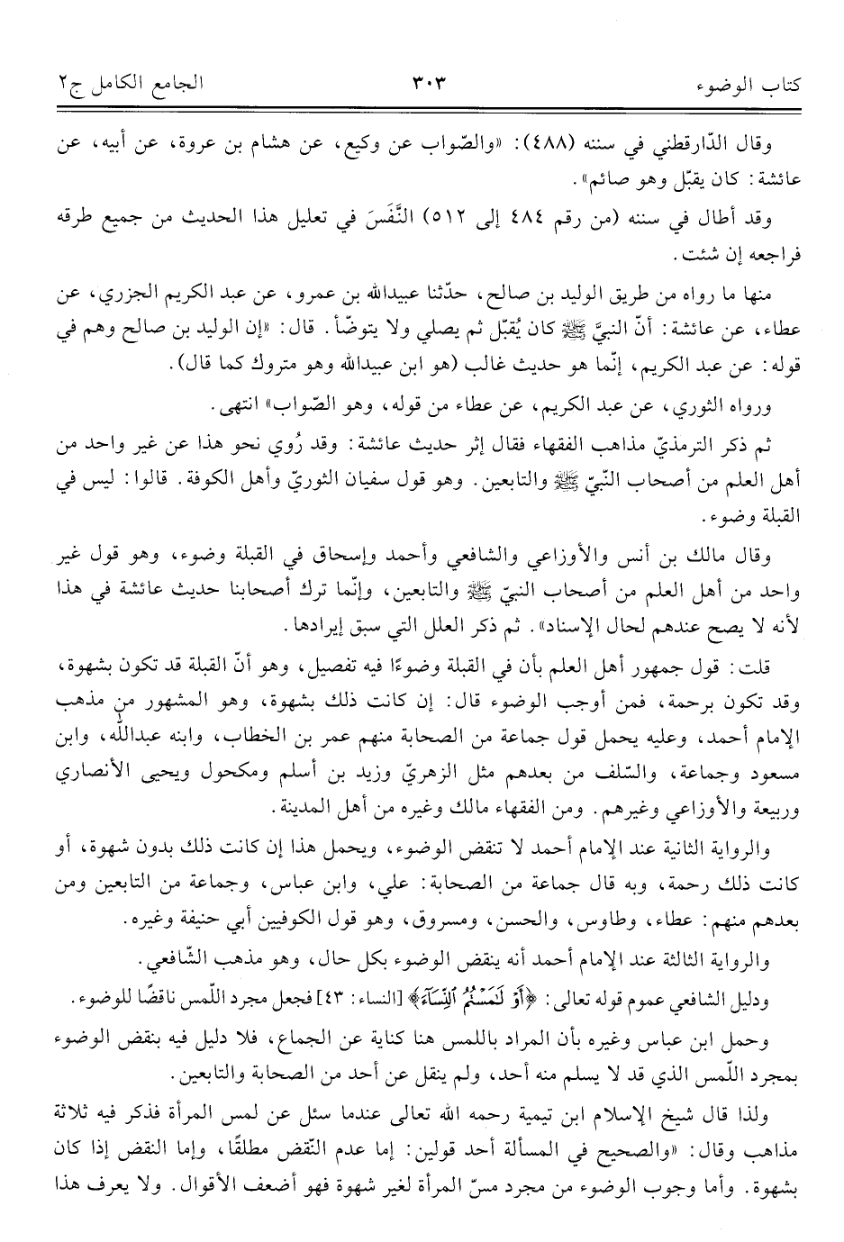 قلت: قول جمهور أهل العلم بأن في القبلة وضوءًا فيه تفصيل، وهو أنّ القبلة قد تكون بشهوة، وقد تكون برحمة، فمن أوجب الوضوء قال: إن كانت ذلك بشهوة، وهو المشهور من مذهب الإمام أحمد، وعليه يحمل قول جماعة من الصحابة منهم عمر بن الخطاب، وابنه عبد الله، وابن مسعود وجماعة، والتلف من بعدهم مثل الزهريّ وزيد بن أسلم ومكحول ويحيى الأنصاري وربيعة والأوزاعي وغيرهم. ومن الفقهاء مالك وغيره من أهل المدينة.