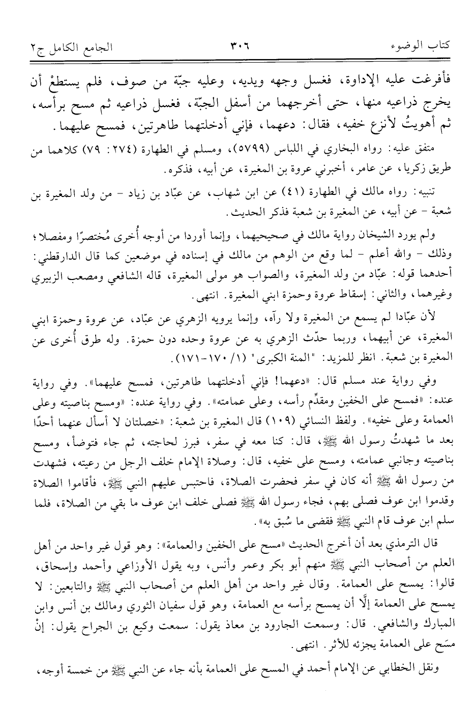 قال الترمذي بعد أن أخرج الحديث "مسح على الخفين والعمامة": وهو قول غير واحد من أهل العلم من أصحاب النبي - صلى الله عليه وسلم - منهم أبو بكر وعمر وأنس، وبه يقول الأوزاعي وأحمد وإسحاق، قالوا: يمسح على العمامة. وقال غير واحد من أهل العلم من أصحاب النبي - صلى الله عليه وسلم - والتابعين: لا يمسح على العمامة إلَّا أن يمسح برأسه مع العمامة، وهو قول سفيان الثوري ومالك بن أنس وابن المبارك والشافعي. قال: وسمعت الجارود بن معاذ يقول: سمعت وكيع بن الجراح يقول: إنْ مسح على العمامة يجزئه للأثر. انتهى