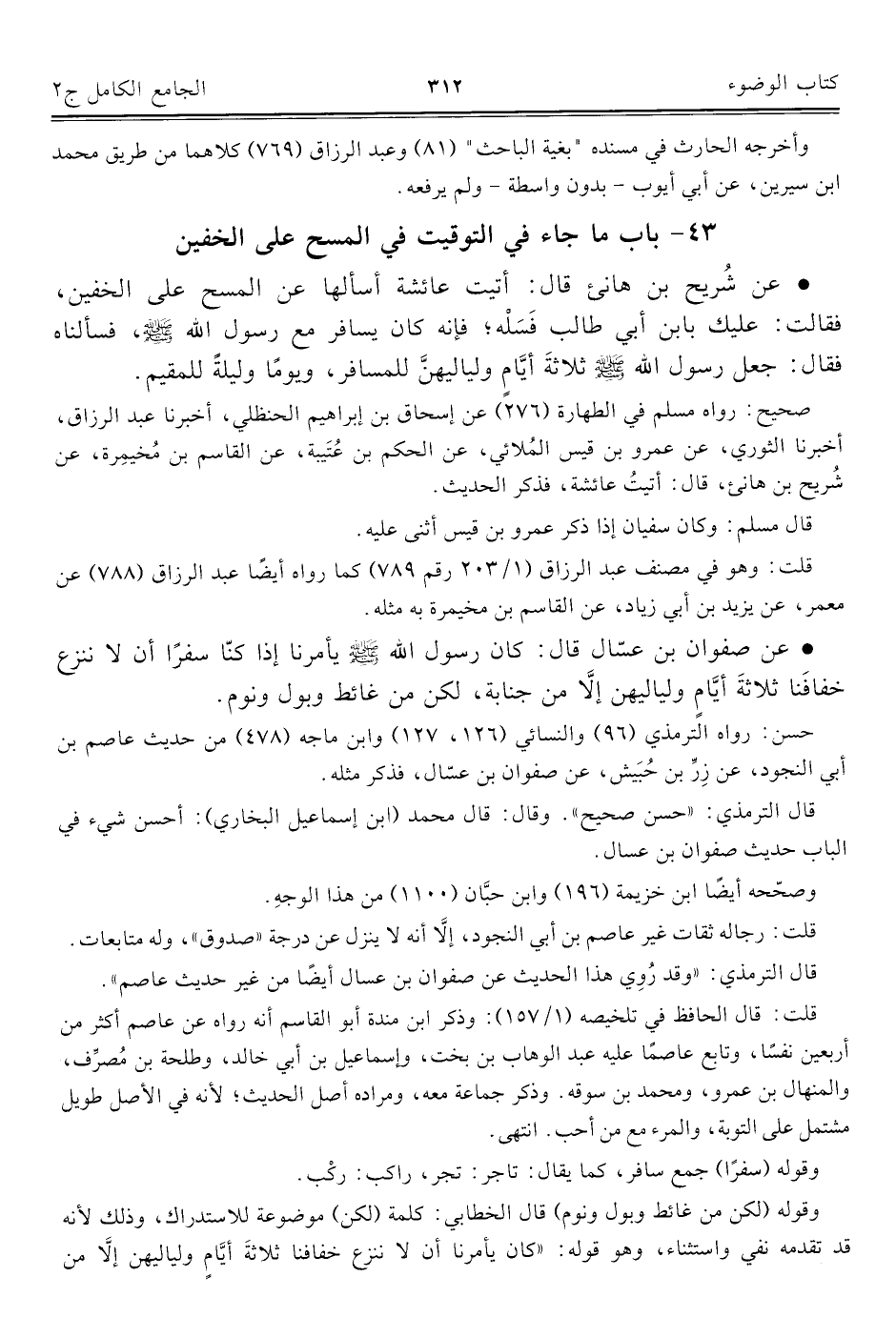 • عن صفوان بن عسّال قال: كان رسول الله - صلى الله عليه وسلم - يأمرنا إذا كنّا سفرًا أن لا ننزع خفافنا ثلاثةَ أيَّامٍ ولياليهن إلَّا من جنابة، لكن من غائط وبول ونوم.