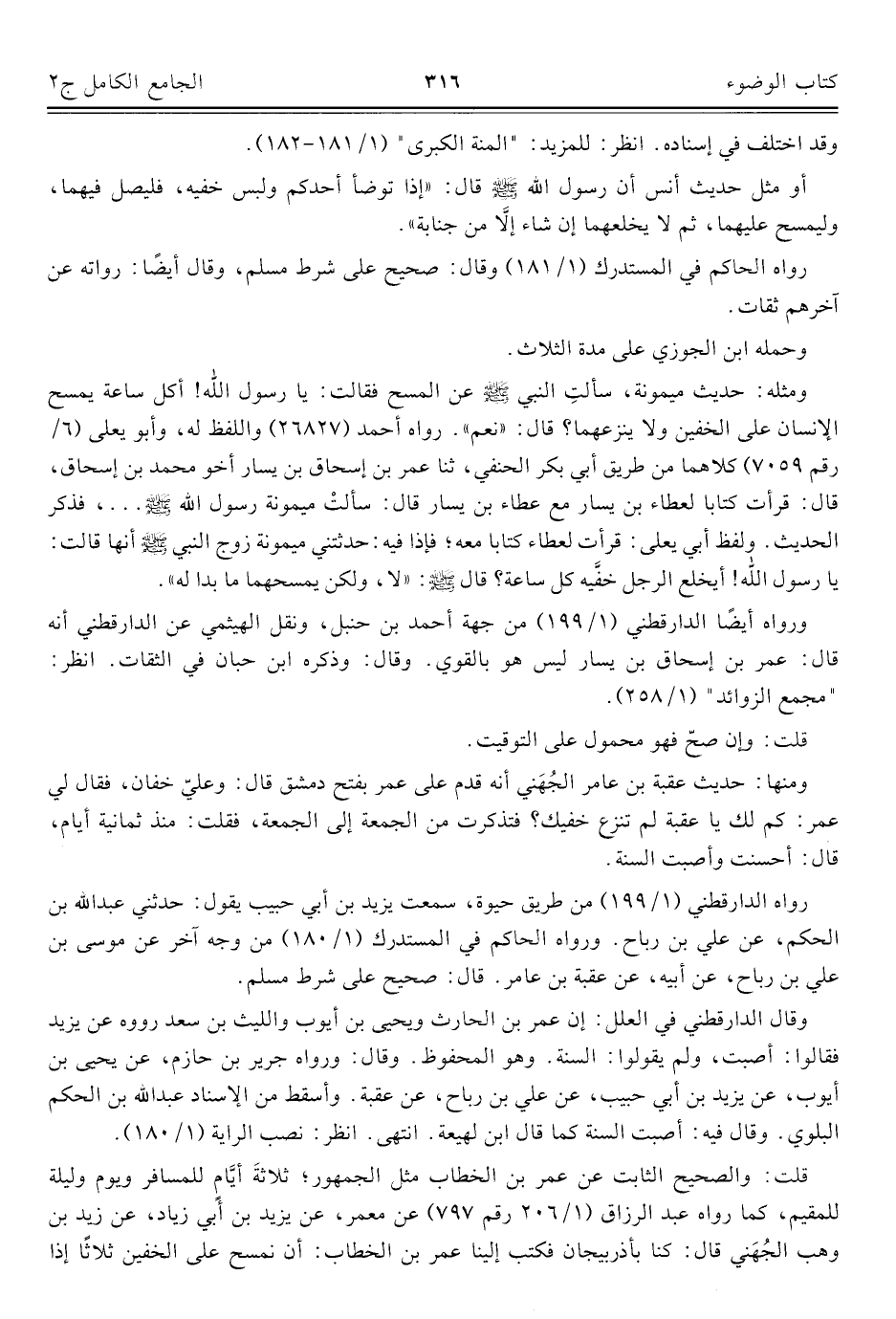 قلت: والصحيح الثابت عن عمر بن الخطاب مثل الجمهور؛ ثلاثةَ أيَّامٍ للمسافر ويوم وليلة للمقيم، كما رواه عبد الرزاق (١/ ٢٠٦ رقم ٧٩٧) عن معمر، عن يزيد بن أبي زياد، عن زيد بن وهب الجُهَني قال: كنا بأذربيجان فكتب إلينا عمر بن الخطاب: أن نمسح على الخفين ثلاثًا إذا