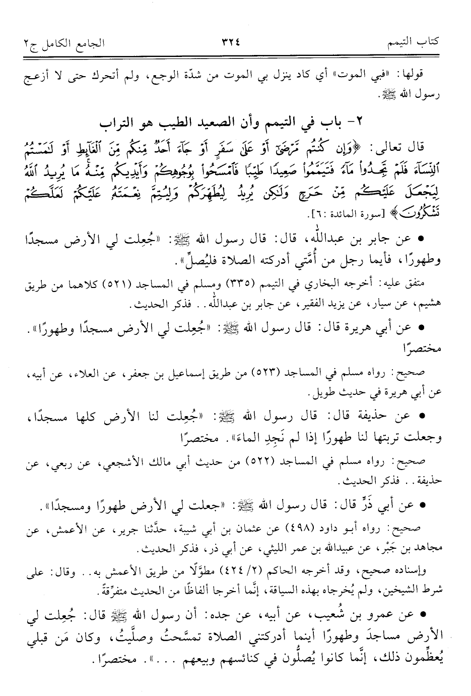 • عن جابر بن عبد الله، قال: قال رسول الله - صلى الله عليه وسلم -: جُعِلت لي الأرض مسجدًا وطهورًا، فأيما رجل من أُمَّتي أدركته الصلاة فليصل".