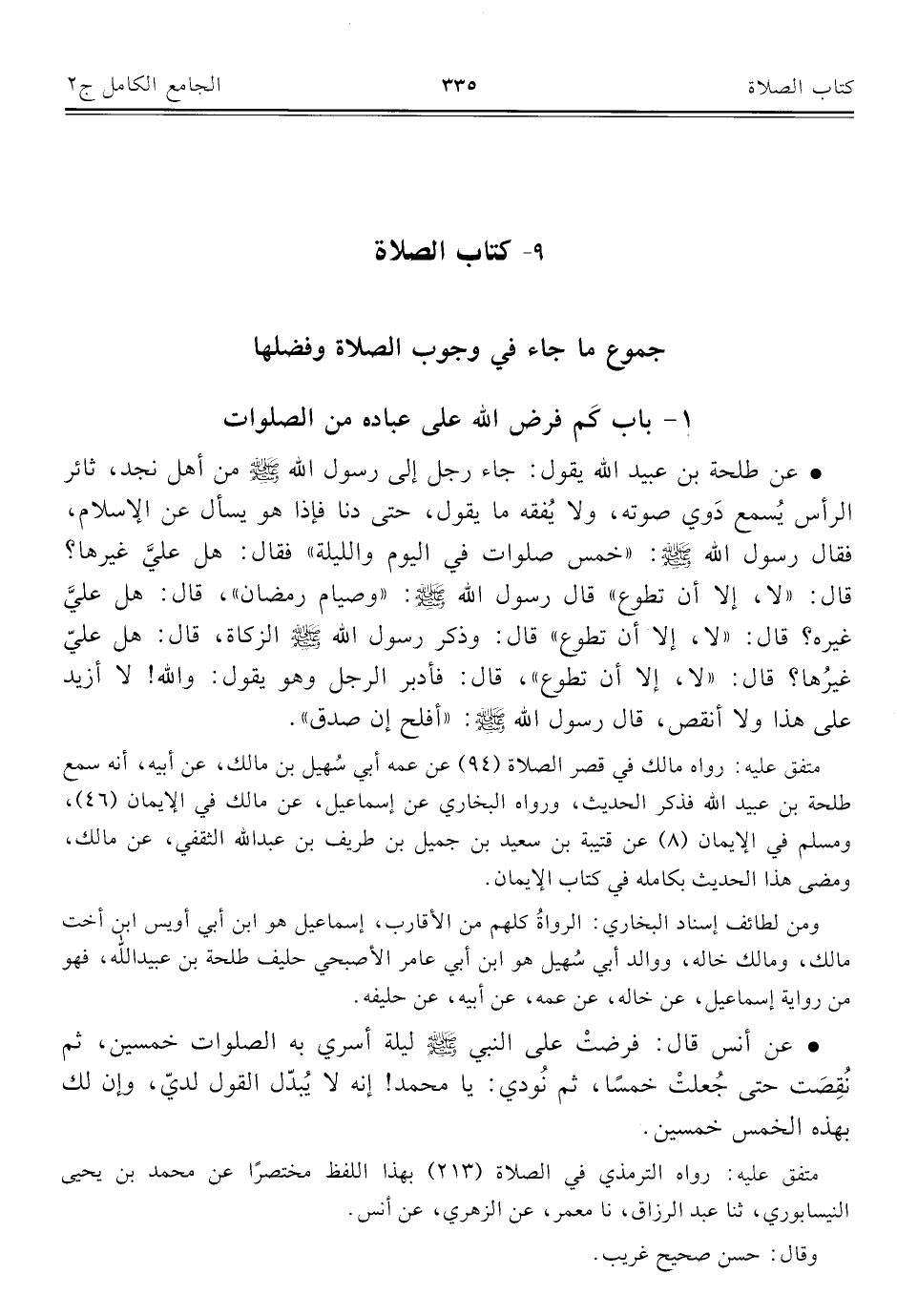 متفق عليه: رواه مالك في قصر الصلاة (٩٤) عن عمه أبي سُهيل بن مالك، عن أبيه، أنه سمع طلحة بن عبيد الله فذكر الحديث، ورواه البخاري عن إسماعيل، عن مالك في الإيمان (٤٦)، ومسلم في الإيمان (٨) عن قتيبة بن سعيد بن جميل بن طريف بن عبد الله الثقفي، عن مالك، ومضى هذا الحديث بكامله في كتاب الإيمان.