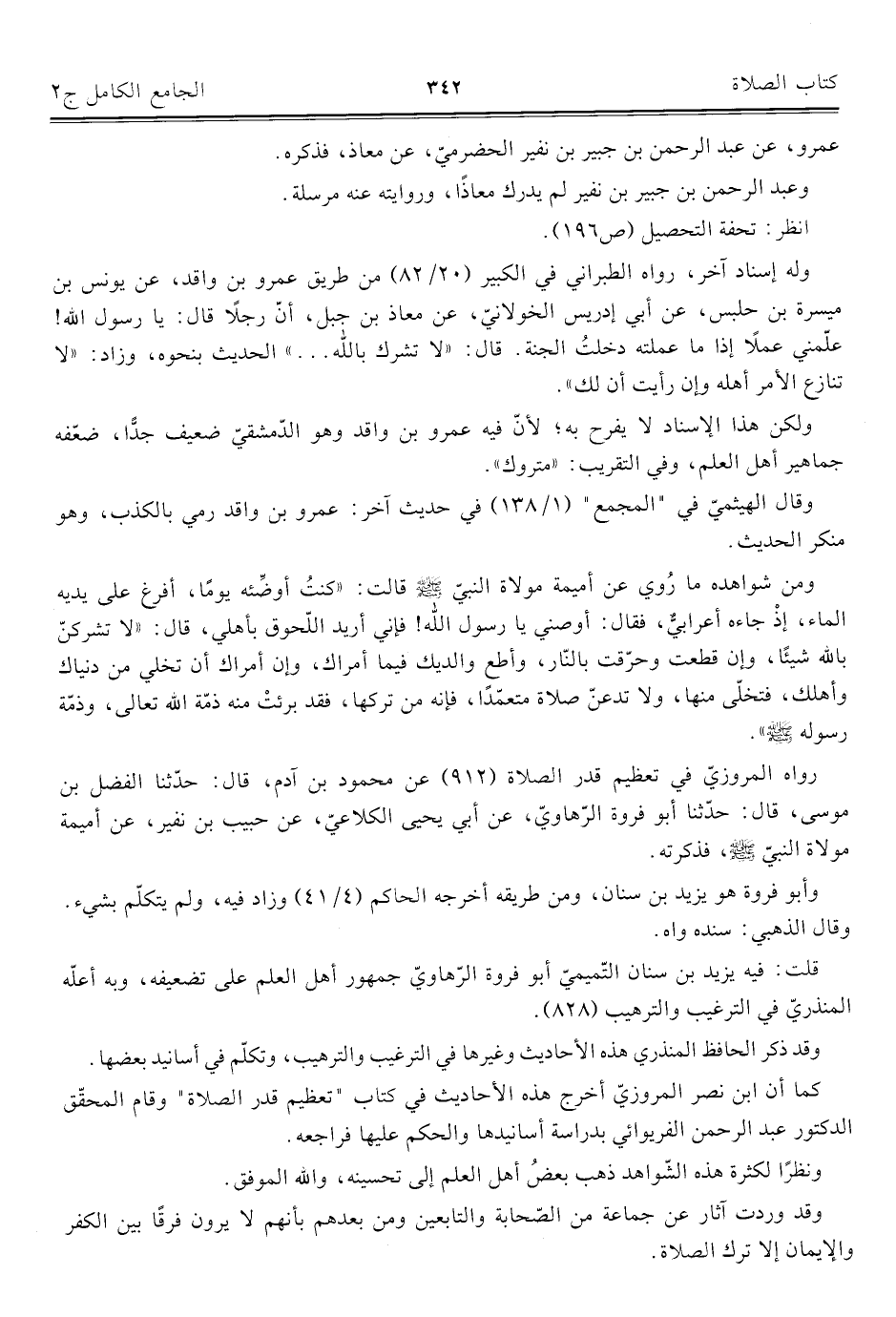 وقد وردت آثار عن جماعة من الصّحابة والتابعين ومن بعدهم بأنهم لا يرون فرقًا بين الكفر والإيمان إلا ترك الصلاة.