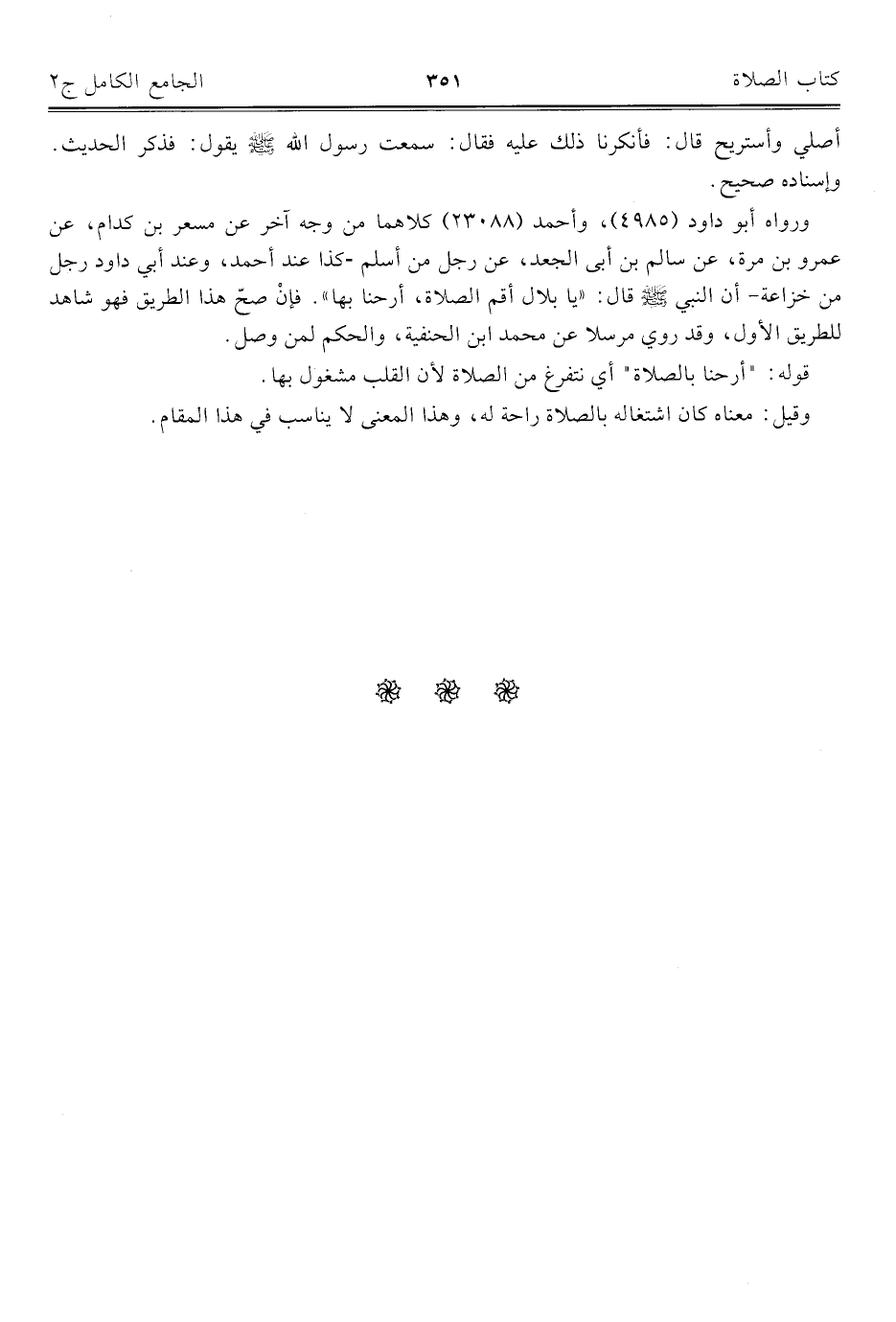 ورواه أبو داود (٤٩٨٥)، وأحمد (٢٣٠٨٨) كلاهما من وجه آخر عن مسعر بن كدام، عن عمرو بن مرة، عن سالم بن أبي الجعد، عن رجل من أسلم - كذا عند أحمد، وعند أبي داود رجل من خزاعة - أن النبي صلى الله عليه وسلم قال: "يا بلال أقم الصلاة، أرحنا بها". فإنْ صحّ هذا الطريق فهو شاهد للطريق الأول، وقد روي مرسلا عن محمد ابن الحنفية، والحكم لمن وصل.