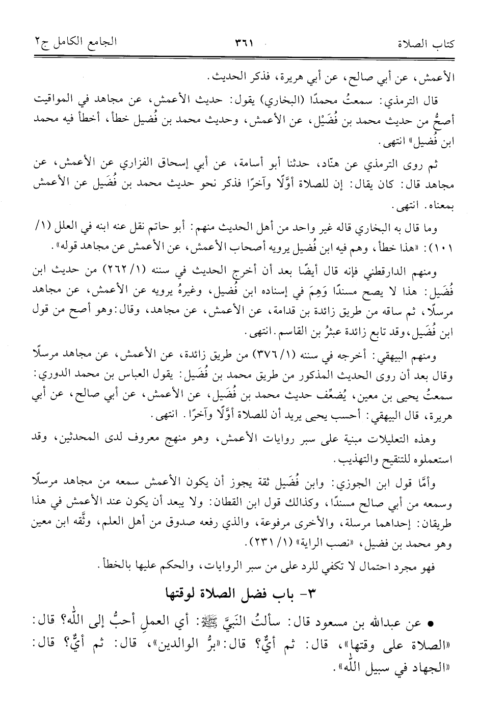 قال الترمذي: سمعتُ محمدًا (البخاري) يقول: حديث الأعمش، عن مجاهد في المواقيت أصح من حديث محمد بن فُضَيل، عن الأعمش، وحديث محمد بن فُضيل خطأ، أخطأ فيه محمد بن فُضيل" انتهى.