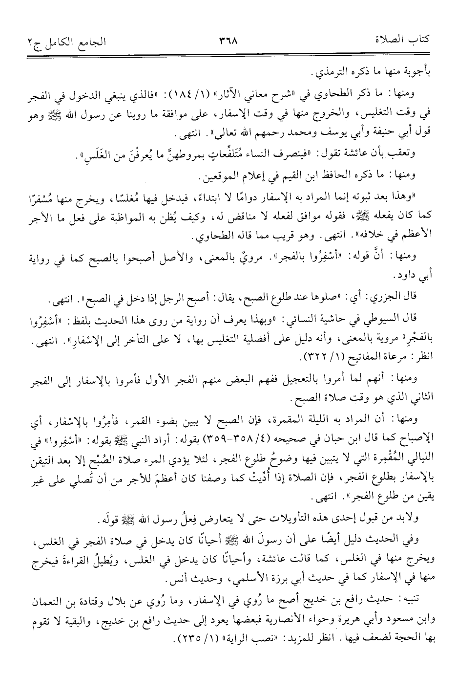 تنبيه: حديث رافع بن خديج أصح ما رُوي في الإسفار، وما رُوي عن بلال وقتادة بن النعمان وابن مسعود وأبي هريرة وحواء الأنصارية فبعضها يعود إلى حديث رافع بن خديج، والبقية لا تقوم بها الحجة لضعف فيها. انظر للمزيد: "نصب الراية" (١/ ٢٣٥).