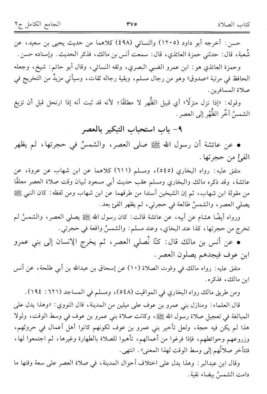• عن أنس بن مالك قال: كنّا نُصلي العصر، ثم يخرج الإنسان إلى بني عمرو بن عوف فيجدهم يصلون العصر.