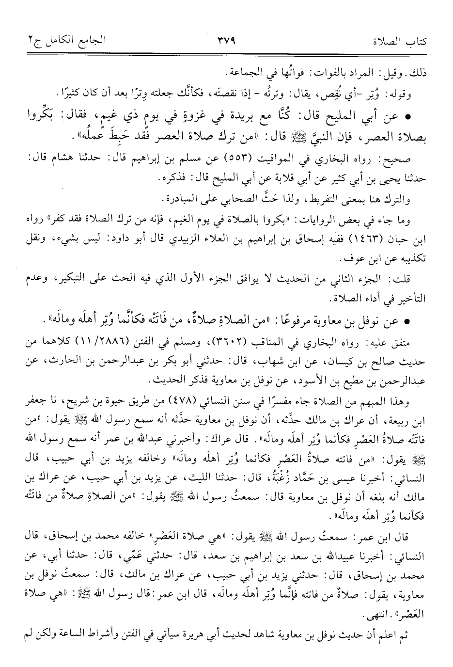 وهذا المبهم من الصلاة جاء مفسرًا في سنن النسائي (٤٧٨) من طريق حيوة بن شريح، نا جعفر بن ربيعة، أن عراك بن مالك حدَّثه، أن توفل بن معاوية حدَّثه أنه سمع رسول الله - صلى الله عليه وسلم - يقول: "من فاتَته صلاة العَصرِ فكأنما وُتِر أهلَه ومالَه". قال عراك: وأخبرني عبد الله بن عمر أنه سمع رسول الله - صلى الله عليه وسلم - يقول: "من فاتته صلاةُ العَصرِ فكأنما وُتِر أهله ومالهَ" وخالفه يزيد بن أبي حبيب، قال النسائي: أخبرنا عيسى بن حَمَّاد زُغبَةُ، قال: حدثنا الليث، عن يزيد بن أبي حبيب، عن عراك بن مالك أنه بلغه أن نوفل بن معاوية قال: سمعتُ رسول الله - صلى الله عليه وسلم - يقول: "من الصلاِة صلاة من فاتته فكأنما وُتِر أهلَه ومالَه".
