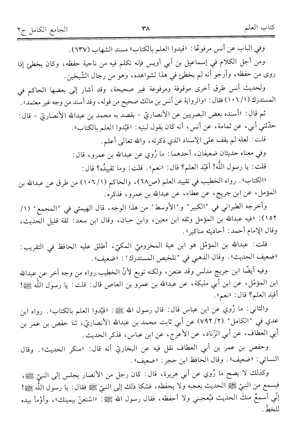 وفيه أيضًا ابن جريج مدلس وقد عنعن، ولكنه توبع لأنّ الخطيب رواه من وجه آخر عن عبد اللَّه ابن المؤمّل، عن ابن أبي مليكة، عن عبد اللَّه بن عمرو بن العاص قال: قلت: يا رسول اللَّه -صلى اللَّه عليه وسلم-! أقيد العلم؟ قال: "نعم".