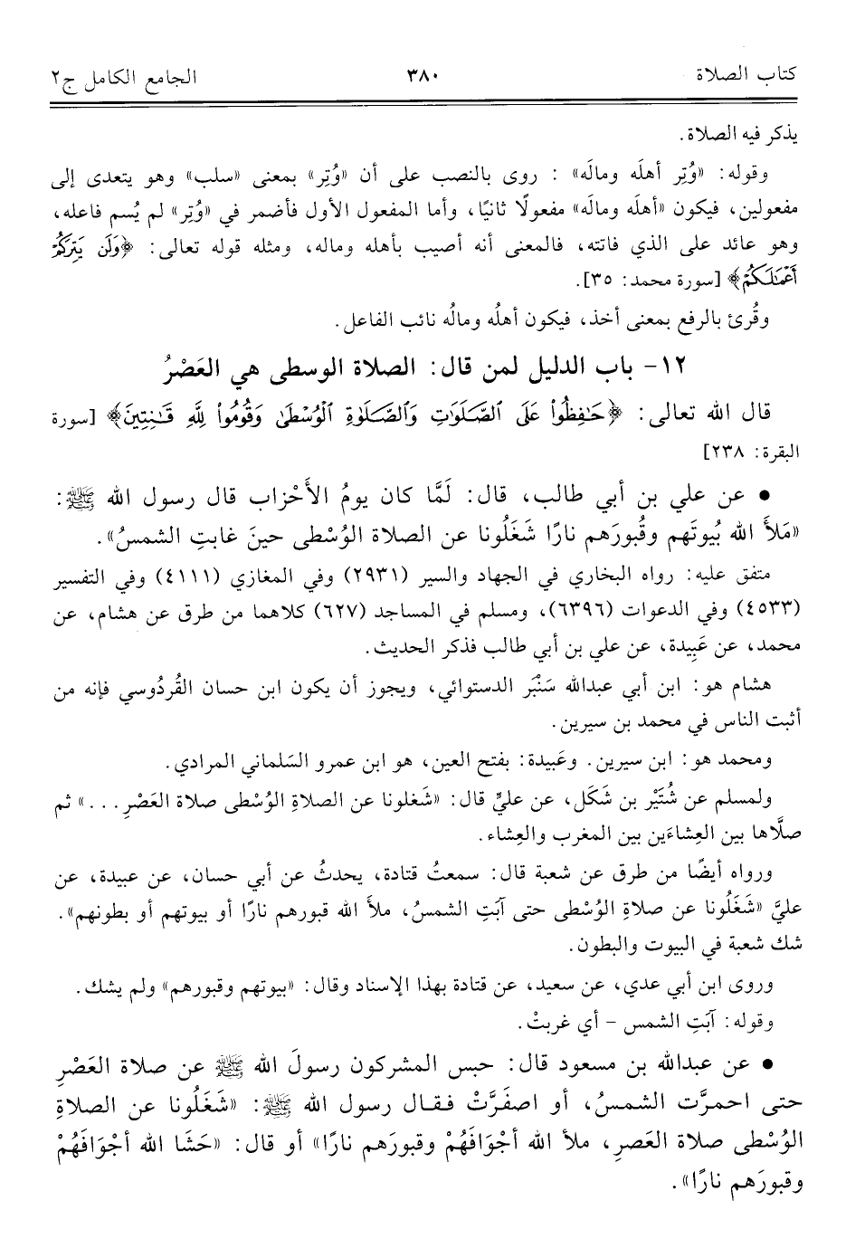 ورواه أيضًا من طرق عن شعبة قال: سمعتُ قتادة، يحدثُ عن أبي حسان، عن عبيدة، عن عليَّ "شَغَلُونا عن صلاة الوُسْطى حتى آبَتِ الشمسُ، ملأَ الله قبورهم نارًا أو بيوتهم أو بطونهم". شك شعبة في البيوت والبطون.