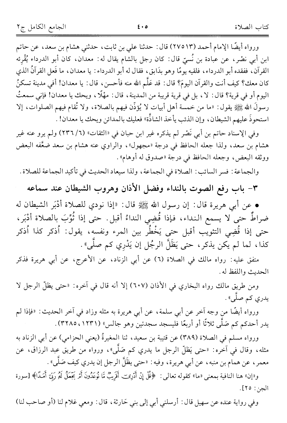 ورواه أيضًا الإمام أحمد (٢٧٥١٣) قال: حدثنا علي بن ثابت، حدثني هشام بن سعد، عن حاتم بن أبي نصْر، عن عبادة بن نُسيّ قال: كان رجل بالشام يقال له: معدان، كان أبو الدرداء يُقْرِئه القرآن، ففقده أبو الدرداء، فلقيه يومًا وهو بدَابق، فقال له أبو الدرداء: يا معدان، ما فَعل القرآنُ الذي كان معك؟ كيف أنت والقرآن اليومَ؟ قال: قد عَلَّم الله منه فأحسن، قال: يا معدان! أفي مدينة تسكنُ اليوم أو في قرية؟ قال: لا، بل في قرية قريبة من المدينة، قال: مهْلًا، ويحك يا معدان! فإني سمعتُ رسولَ الله - صلى الله عليه وسلم - يقول: "ما من خمسة أهل أبيات لا يُؤذّن فيهم بالصلاة، ولا تُقام فيهم الصلوات، إلا استحوذَ عليهم الشيطان، وإن الذئب يأخذ الشاذَّة" فعليك بالمدائن ويحك يا معدان! .