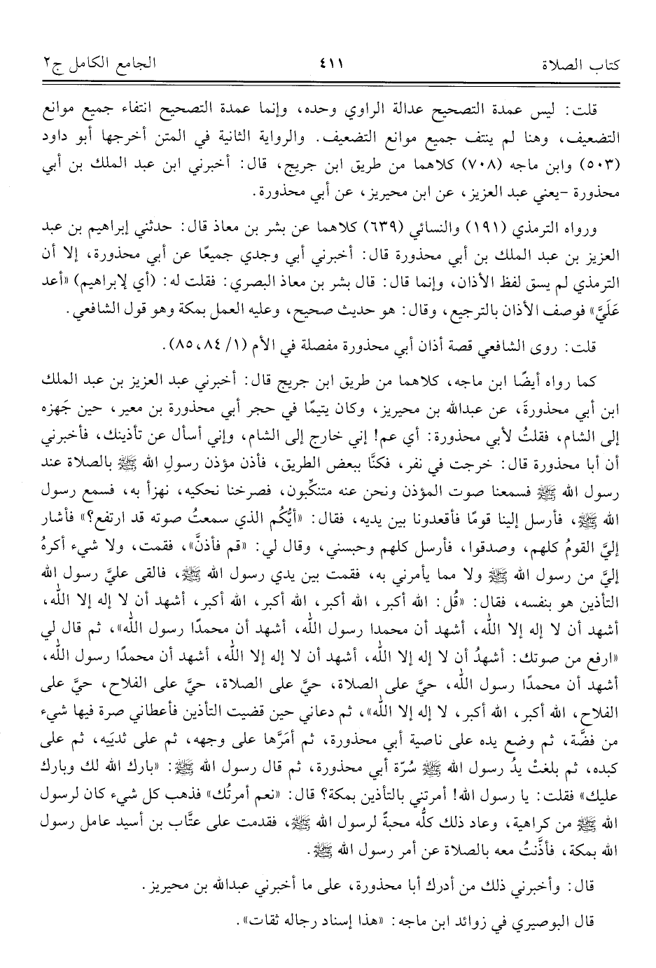 قلت: ليس عمدة التصحيح عدالة الراوي وحده، وإنما عمدة التصحيح انتفاء جميع موانع التضعيف، وهنا لم ينتف جميع موانع التضعيف. والرواية الثانية في المتن أخرجها أبو داود (٥٠٣) وابن ماجه (٧٠٨) كلاهما من طريق ابن جريج، قال: أخبرني ابن عبد الملك بن أبي محذورة - يعني عبد العزيز، عن ابن محيريز، عن أبي محذورة.
