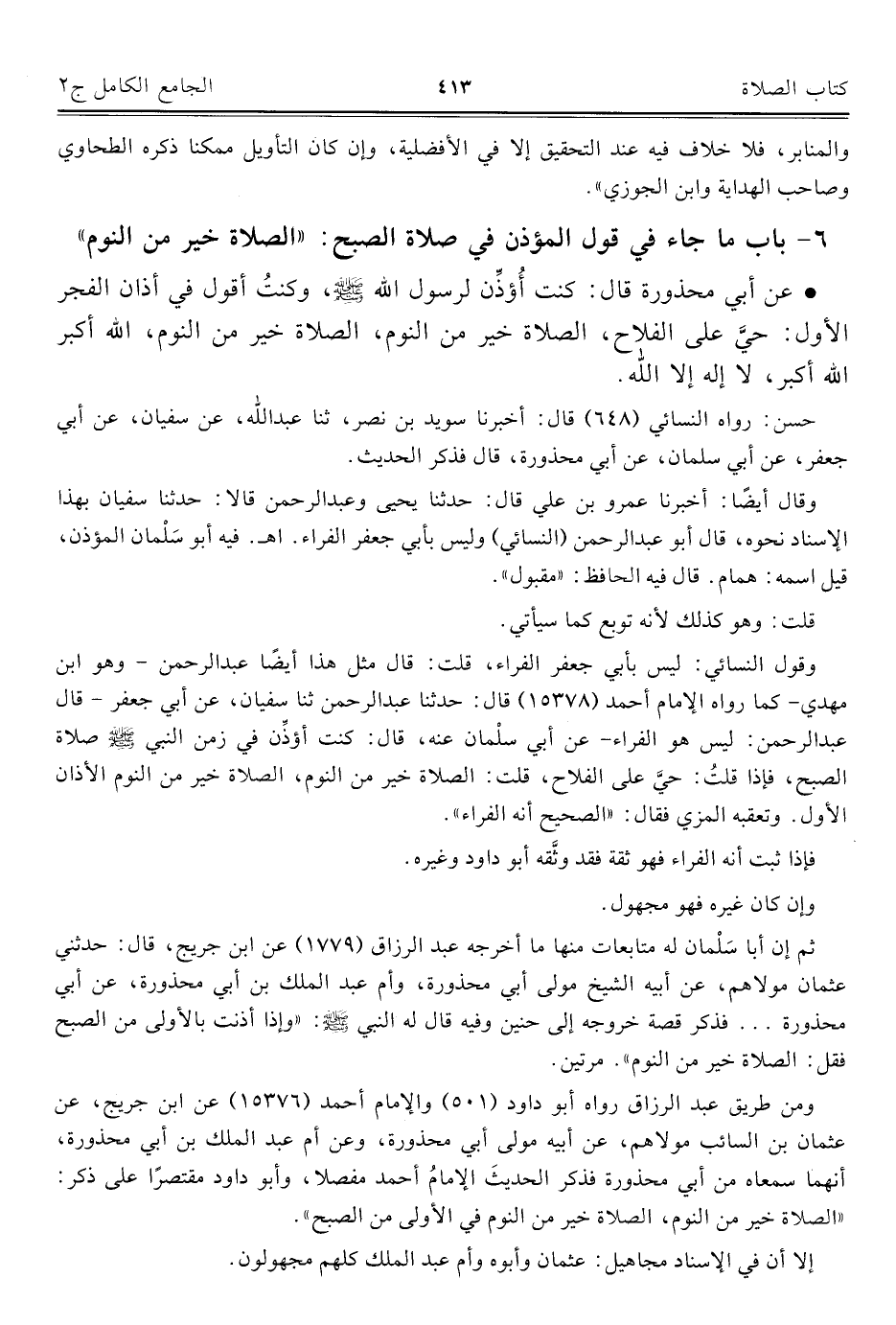 وقول النسائي: ليس بأبي جعفر الفراء، قلت: قال مثل هذا أيضًا عبد الرحمن وهو ابن مهدي - كما رواه الإمام أحمد (١٥٣٧٨) قال: حدثنا عبد الرحمن ثنا سفيان، عن أبي جعفر - قال عبد الرحمن: ليس هو الفراء - عن أبي سلْمان عنه، قال: كنت أؤذِّن في زمن النبي صلَّى الله عليه وسلَّم صلاة الصبح، فإذا قلتُ: حيَّ على الفلاح، قلت: الصلاة خير من النوم، الصلاة خير من النوم الأذان الأول. وتعقبه المزي فقال: "الصحيح أنه الفراء".