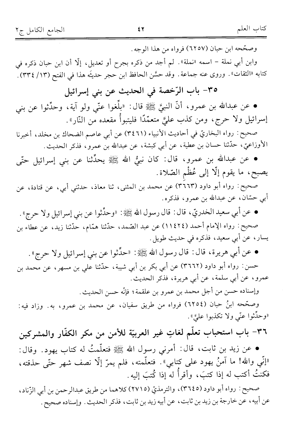 • عن عبد اللَّه بن عمرو، أنّ النبيَّ -صلى اللَّه عليه وسلم- قال: "بلِّغوا عنّي ولو آية، وحدِّثوا عن بني إسرائيل ولا حرج، ومن كذب عليَّ متعمّدًا فليتبوأْ مقعده من النّار".