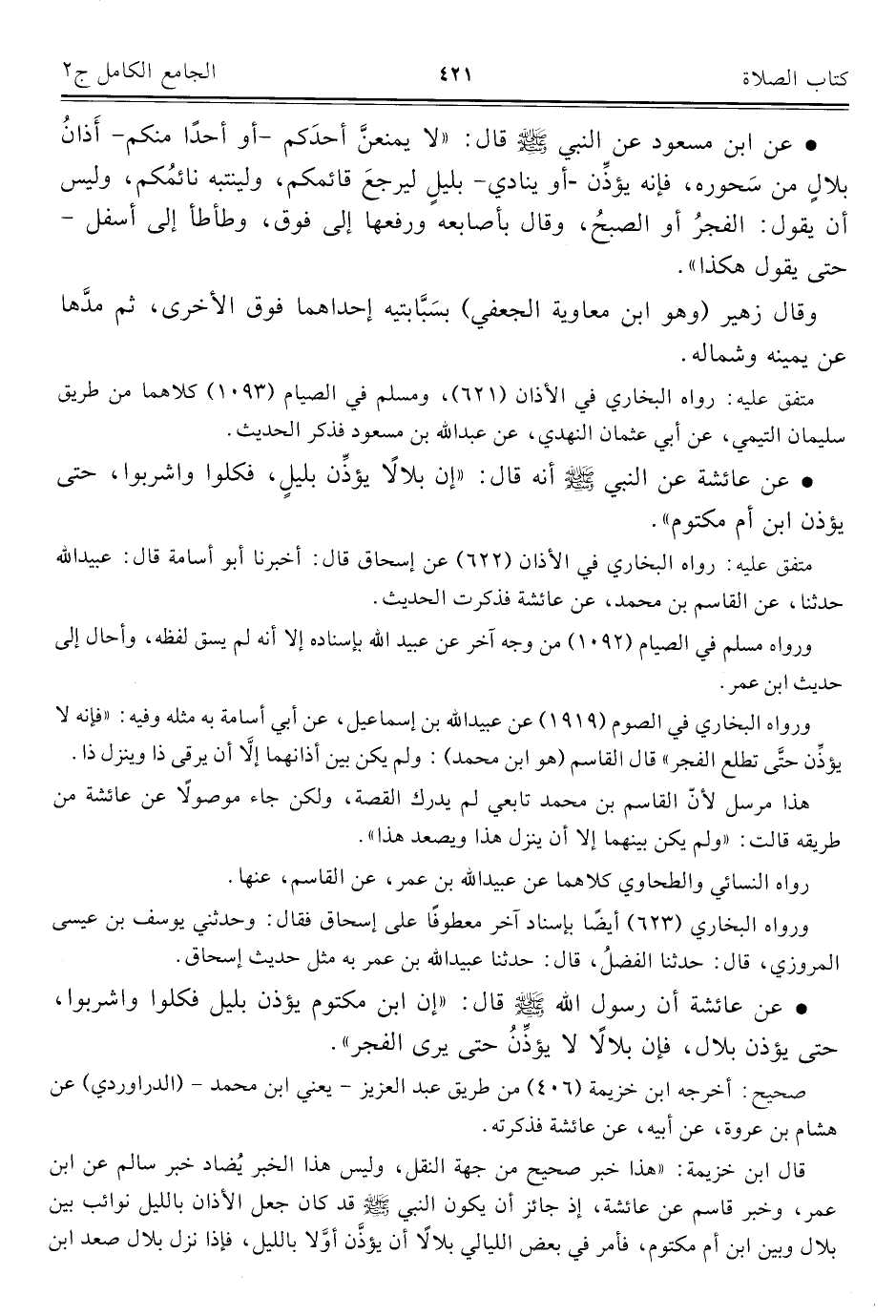 • عن عائشة أن رسول الله - صلى الله عليه وسلم - قال: "إنَّ ابن مكتوم يؤذن بليل فكلوا واشربوا، حتَّى يؤذن بلال، فإن بلالًا لا يؤذِّن حتَّى يرى الفجر".