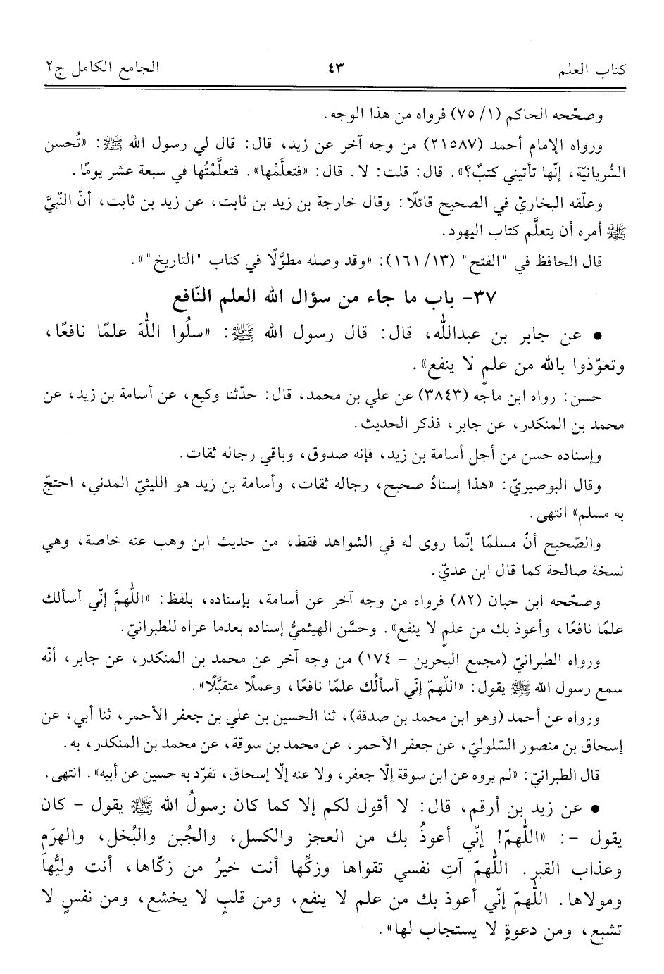 • عن جابر بن عبد اللَّه، قال: قال رسول اللَّه -صلى اللَّه عليه وسلم-: "سلُوا اللَّهَ علمًا نافعًا، وتعوّذوا باللَّه من علمٍ لا ينفع".