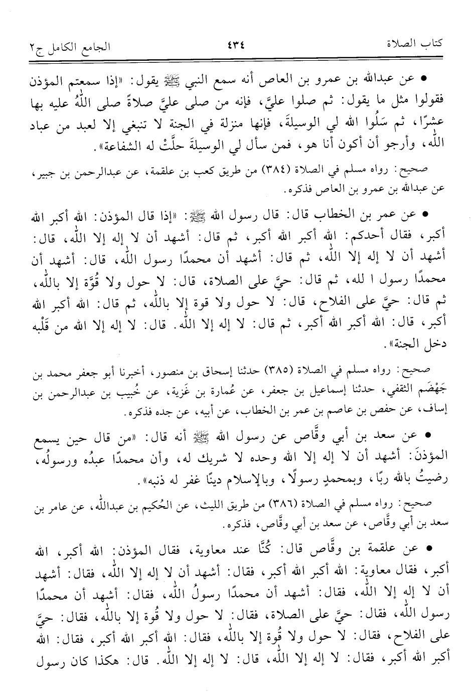 • عن علقمة بن وقَّاص قال: كُنَّا عند معاوية، فقال المؤذن: الله أكبر، الله أكبر، فقال معاوية: الله أكبر الله أكبر، فقال: أشهد أن لا إله إِلَّا الله، فقال: أشهد أن لا إله إِلَّا الله، فقال: أشهد أن محمدًا رسول الله، فقال: أشهد أن محمدًا رسول الله، فقال: حيَّ على الصّلاة، فقال: لا حول ولا قُوة إِلَّا بالله، فقال: حيَّ على الفلاح، فقال: لا حول ولا قُوة إِلَّا بالله، فقال: الله أكبر الله أكبر، فقال: الله أكبر الله أكبر، فقال: لا إله إِلَّا الله، قال: لا إله إِلَّا الله. قال: هكذا كان رسول