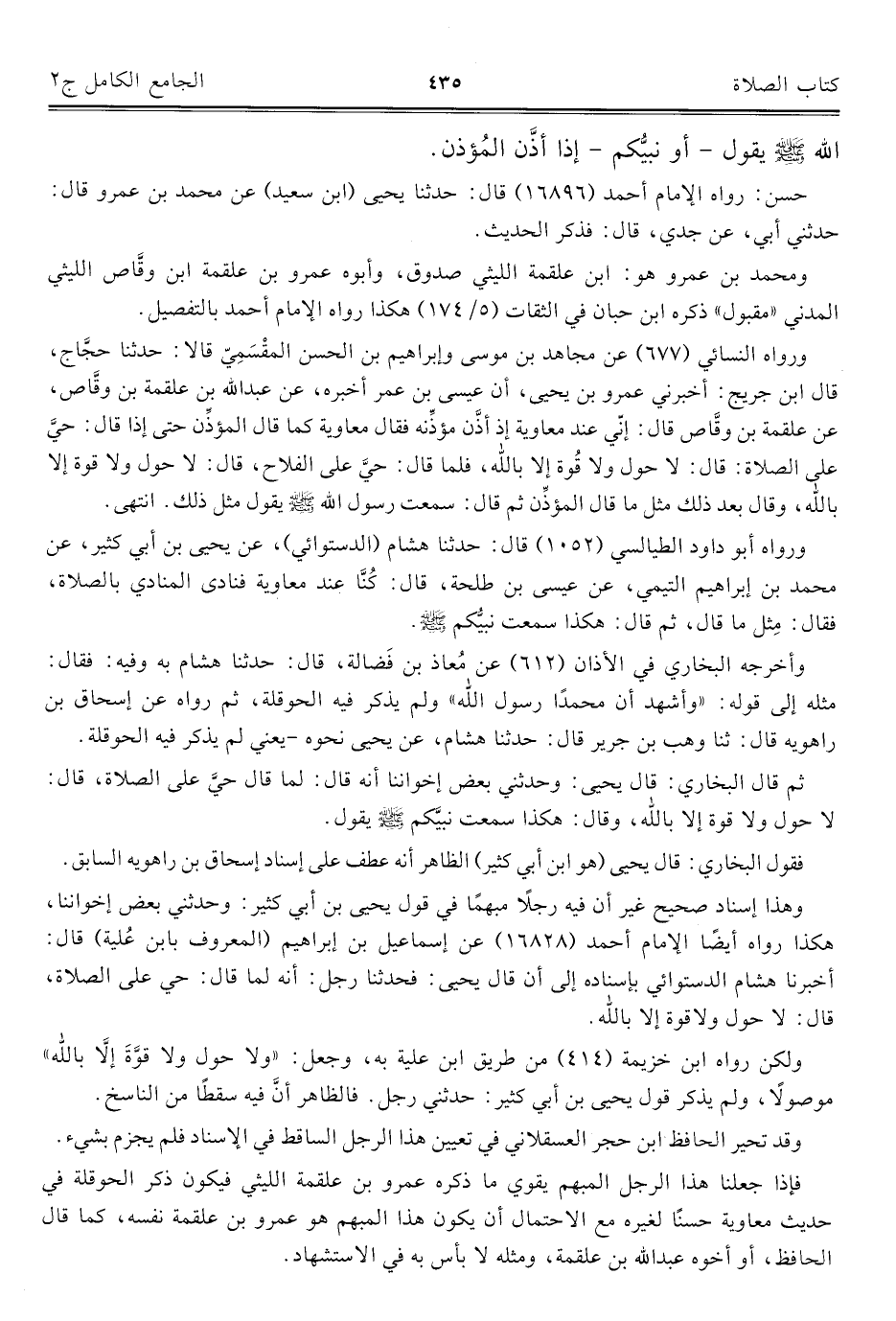 وهذا إسناد صحيح غير أن فيه رجلًا مبهمًا في قول يحيى بن أبي كثير: وحدثني بعض إخواننا، هكذا رواه أيضًا الإمام أحمد (١٦٨٢٨) عن إسماعيل بن إبراهيم المعروف بابن عُلية) قال: أخبرنا هشام الدستوائي بإسناده إلى أن قال يحيى: فحدثنا رجل: أنه لما قال: حيَّ على الصّلاة، قال: لا حول ولا قُوة إِلَّا بالله.