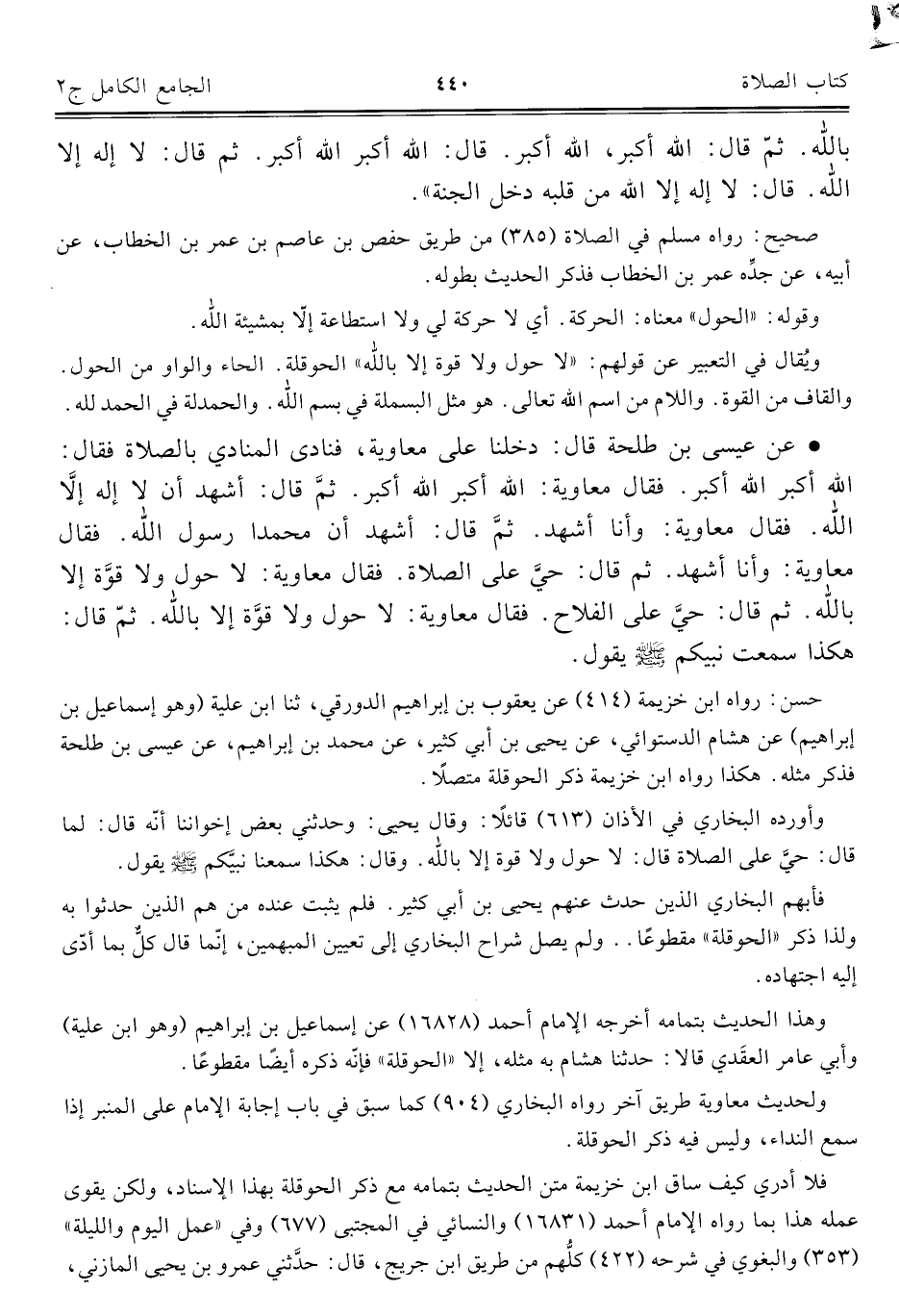 حسن: رواه ابن خزيمة (٤١٤) عن يعقوب بن إبراهيم الدورقيّ، ثنا ابن علية (وهو إسماعيل بن إبراهيم) عن هشام الدستوائيّ، عن يحيى بن أبي كثير، عن محمد بن إبراهيم، عن عيسى بن طلحة فذكر مثله. هكذا رواه ابن خزيمة ذكر الحوقلة متصلًا.