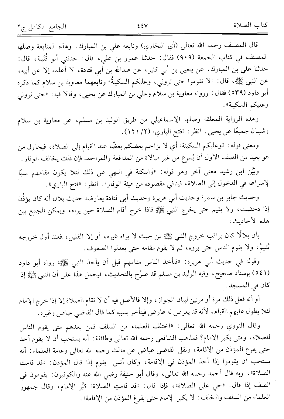 وقوله في حديث أبي هريرة: "فيأخذ الناس مقامهم قبل أن يأخذ النَّبِيّ - صلى الله عليه وسلم - "رواه أبو داود (٥٤١) بإسناد صحيح، وفيه الوليد بن مسلم قد صرَّح بالتحديث، فيحمل هذا على أن النَّبِيّ صلى الله عليه وسلم إذا كان في المسجد.