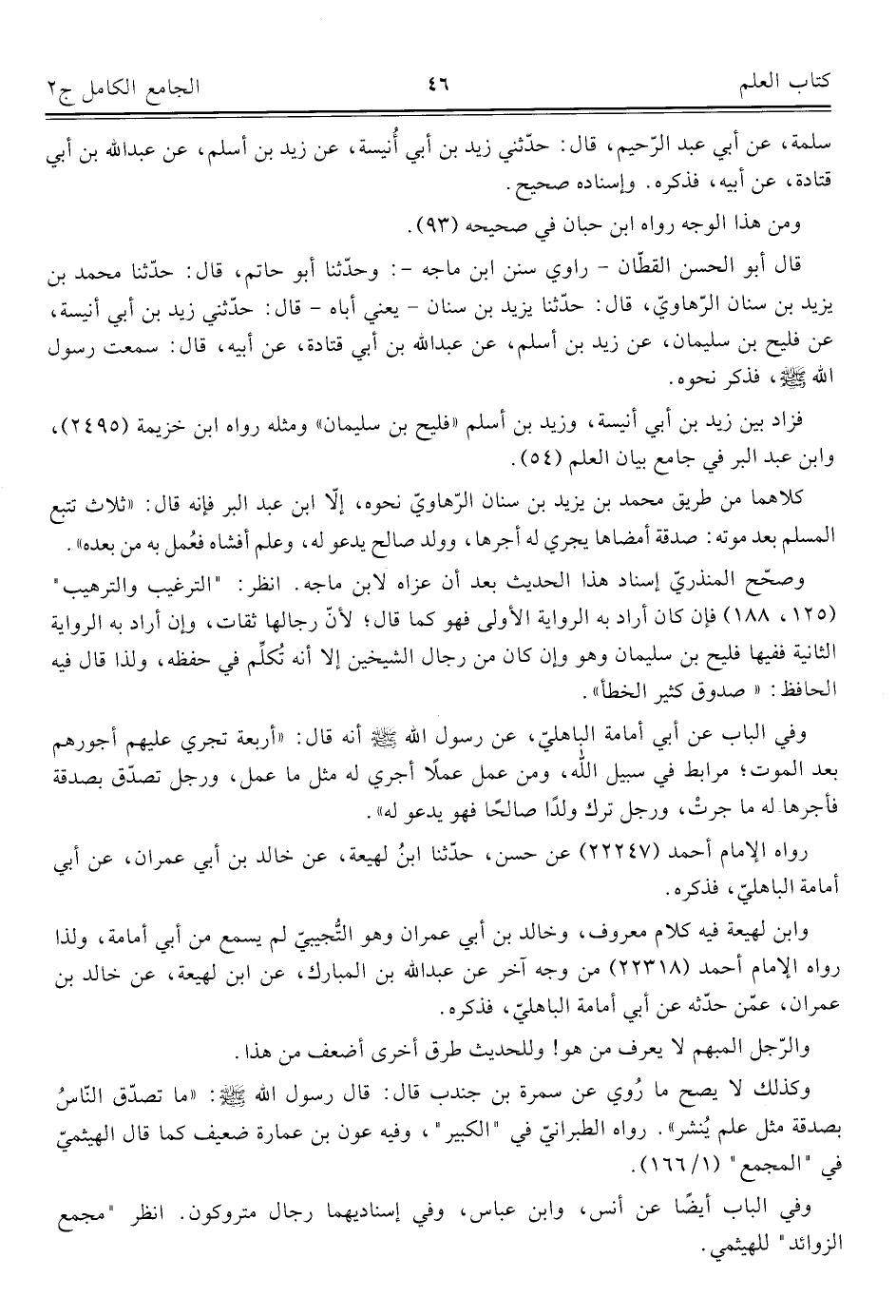 فزاد بين زيد بن أبي أنيسة، وزيد بن أسلم "فليح بن سليمان" ومثله رواه ابن خزيمة (٢٤٩٥)، وابن عبد البر في جامع بيان العلم (٥٤).