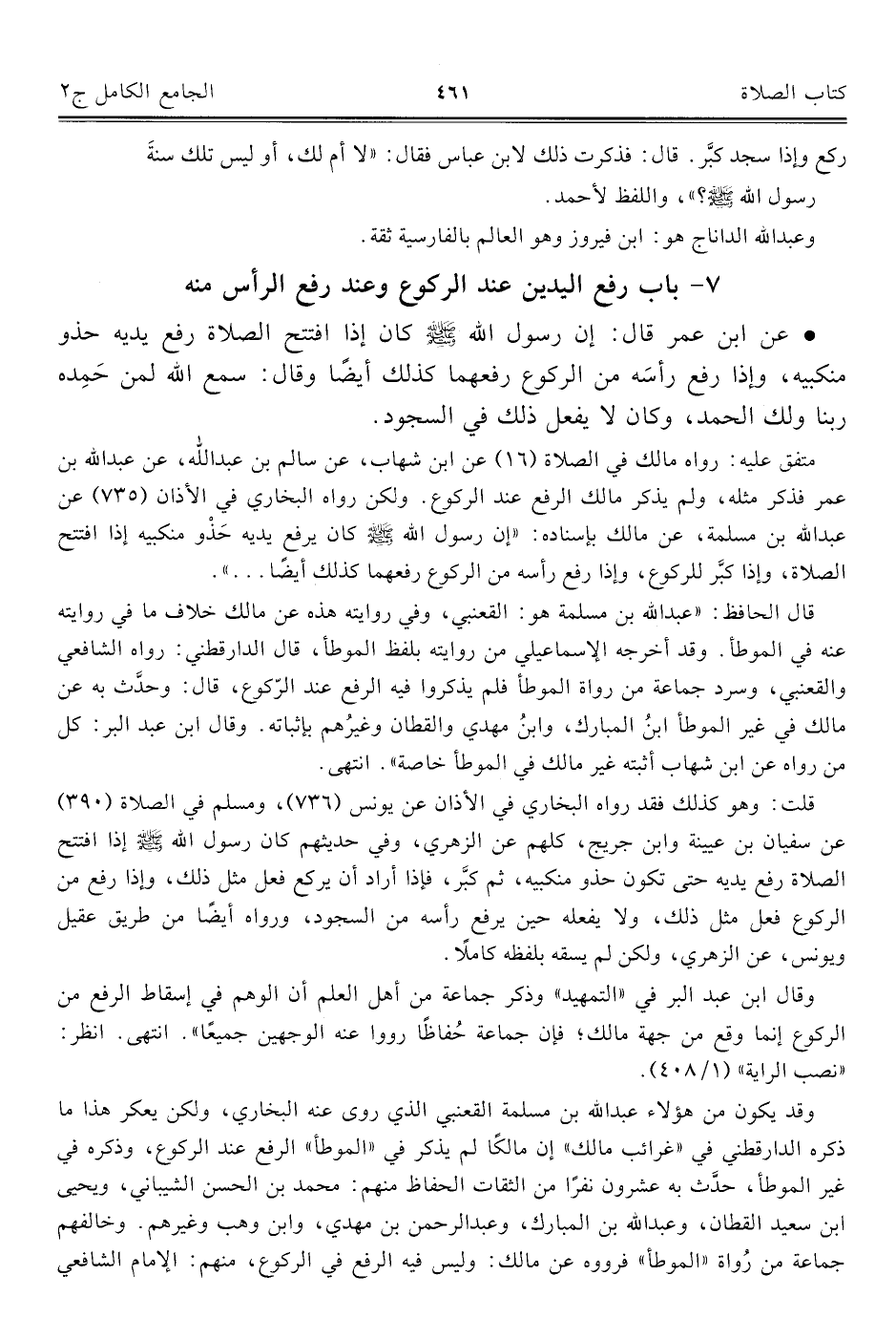 وقال ابن عبد البر في "التمهيد" وذكر جماعة من أهل العلم أن الوهم في إسقاط الرفع من الركوع إنما وقع من جهة مالك؛ فإن جماعة حُفاظًا رووا عنه الوجهين جميعًا". انتهى. انظر: "نصب الراية" (١/ ٤٠٨).