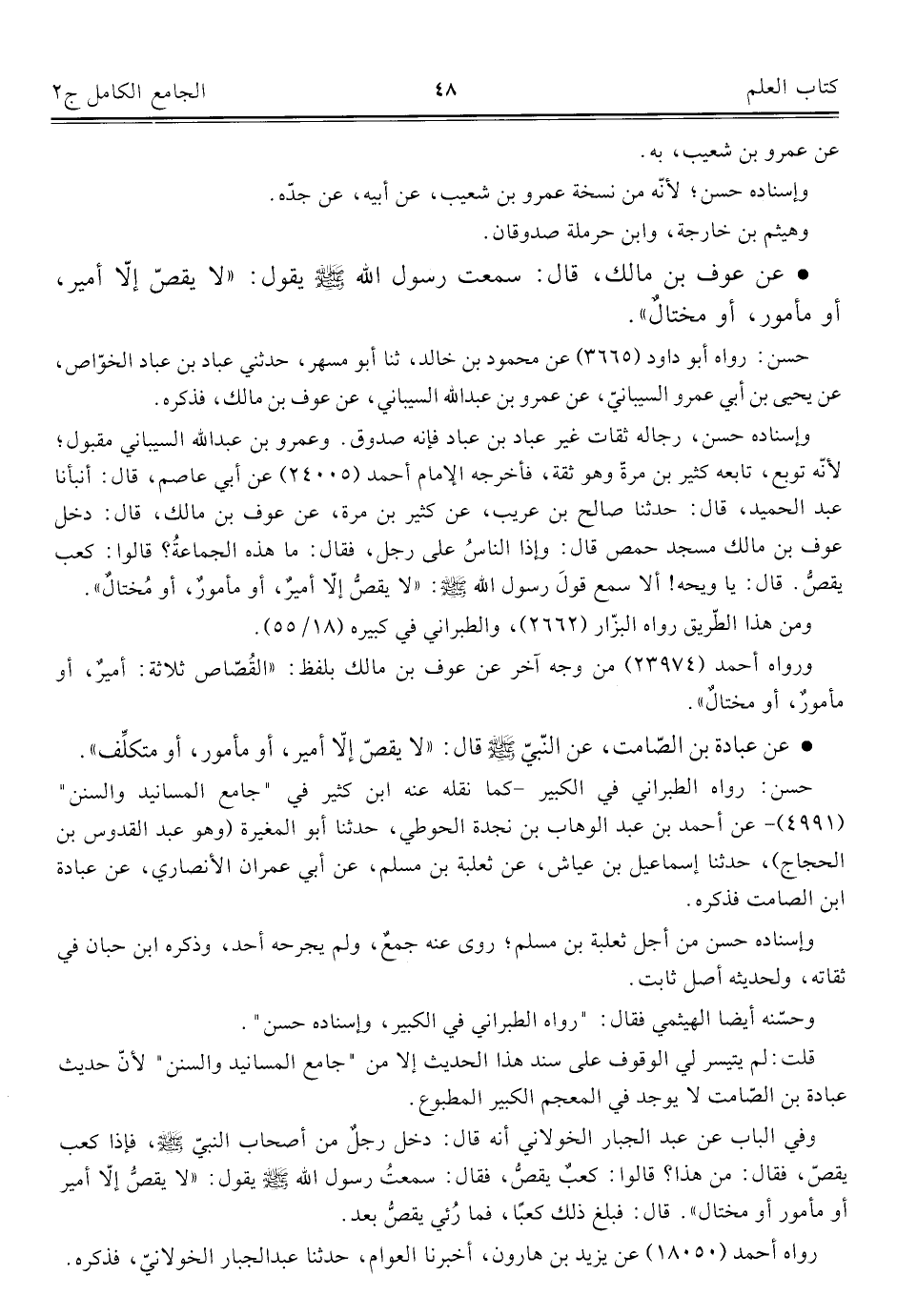 وإسناده حسن، رجاله ثقات غير عباد بن عباد فإنه صدوق. وعمرو بن عبد اللَّه السيباني مقبول؛ لأنّه توبع، تابعه كثير بن مرةّ وهو ثقة، فأخرجه الإمام أحمد (٢٤٠٠٥) عن أبي عاصم، قال: أنبأنا عبد الحميد، قال: حدّثنا صالح بن عريب، عن كثير بن مرة، عن عوف بن مالك، قال: دخل عوف بن مالك مسجد حمص قال: وإذا الناسُ على رجل، فقال: ما هذه الجماعةُ؟ قالوا: كعب يقصُّ. قال: يا ويحه! ألا سمع قولَ رسول اللَّه -صلى اللَّه عليه وسلم-: "لا يقصُّ إلّا أميرٌ، أو مأمورٌ، أو مُختالٌ".